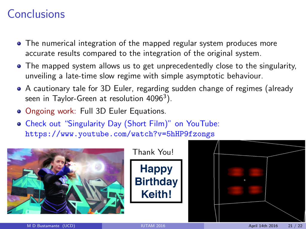 more accurate results compared to the integration of the original system. The mapped system allows us to get unprecedentedly close to the singularity, unveiling a late-time slow regime with simple asymptotic behaviour. A cautionary tale for 3D Euler, regarding sudden change of regimes (already seen in Taylor-Green at resolution 40963 ). Ongoing work: Full 3D Euler Equations. Check out “Singularity Day (Short Film)” on YouTube: https://www.youtube.com/watch?v=5hHP9fzongs Thank You! M D Bustamante (UCD) IUTAM 2016 April 14th 2016 21 / 22 Happy Birthday Keith!