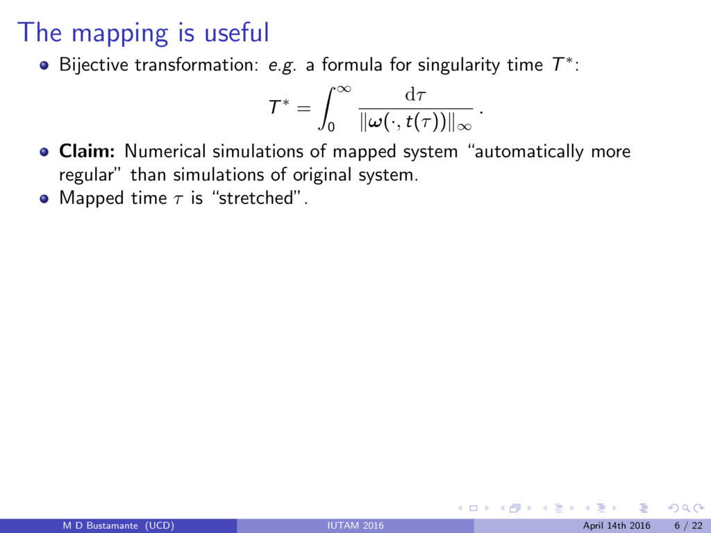 singularity time T⇤: T⇤ = Z 1 0 d⌧ k!(·, t(⌧))k1 . Claim: Numerical simulations of mapped system “automatically more regular” than simulations of original system. Mapped time ⌧ is “stretched”. M D Bustamante (UCD) IUTAM 2016 April 14th 2016 6 / 22
