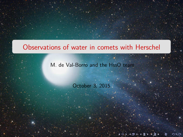 Water main component of cometary nucleus QH 2 O has been estimated from the ground through water high vibrational bands and the OH radical 110–101 ortho-H2O at 557 GHz was observed in several comets by SWAS and Odin Other ortho- and para-H2O, HDO and H18 2 O transitions observed by Herschel (e.g., Hartogh et al. 2010) MIRO has detected H2O, H17 2 O and H18 2 O in comet 67P/Churyumov-Gerasimenko