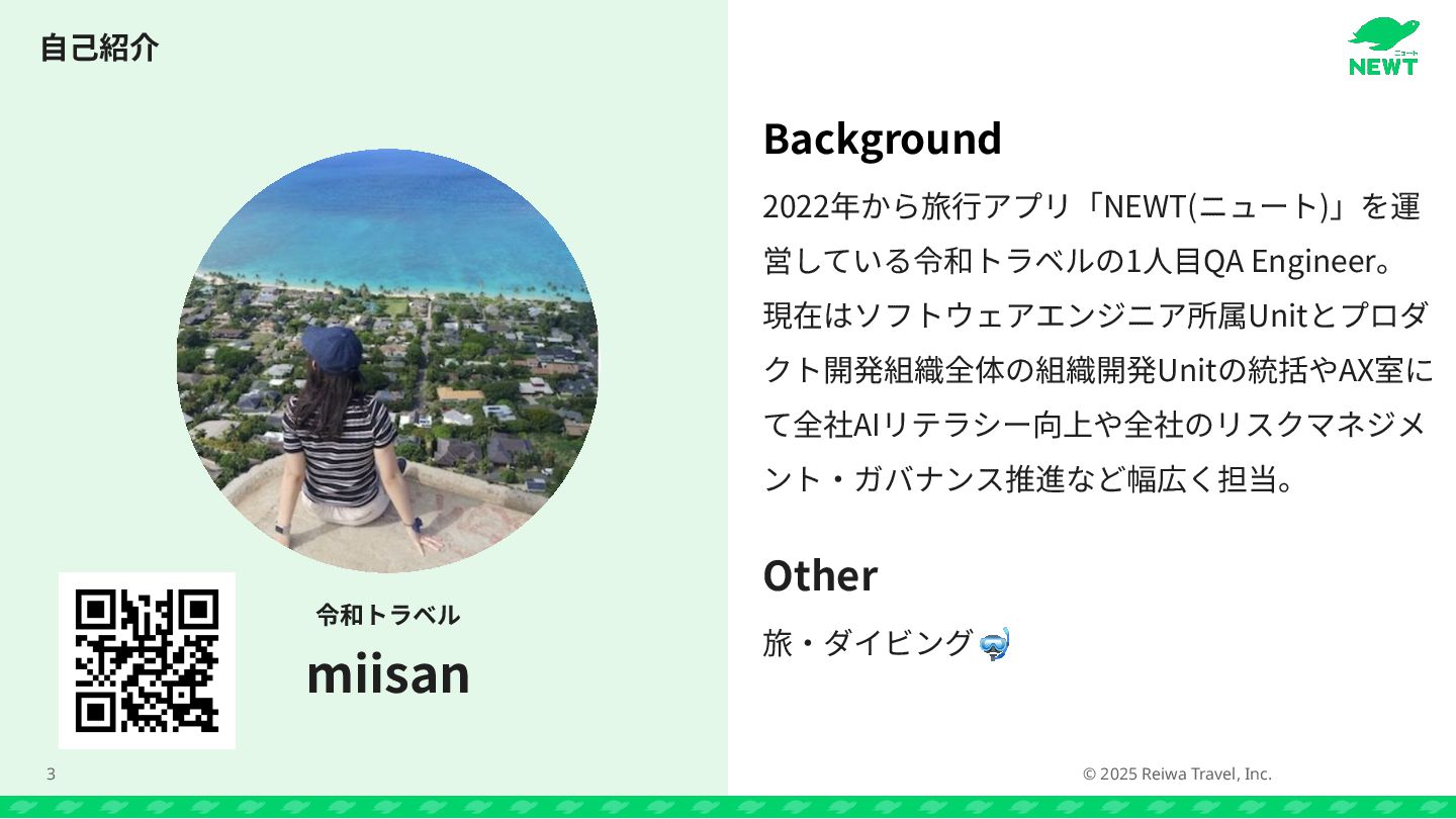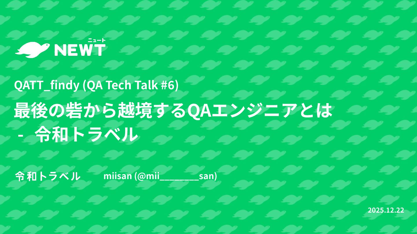 2025/12/22に開催された「最後の砦から越境するQAエンジニアとは AI開発と共に歩む、柔らかな挑戦」のLT登壇の発表資料です。 https://findy.connpass.com/event/376692/