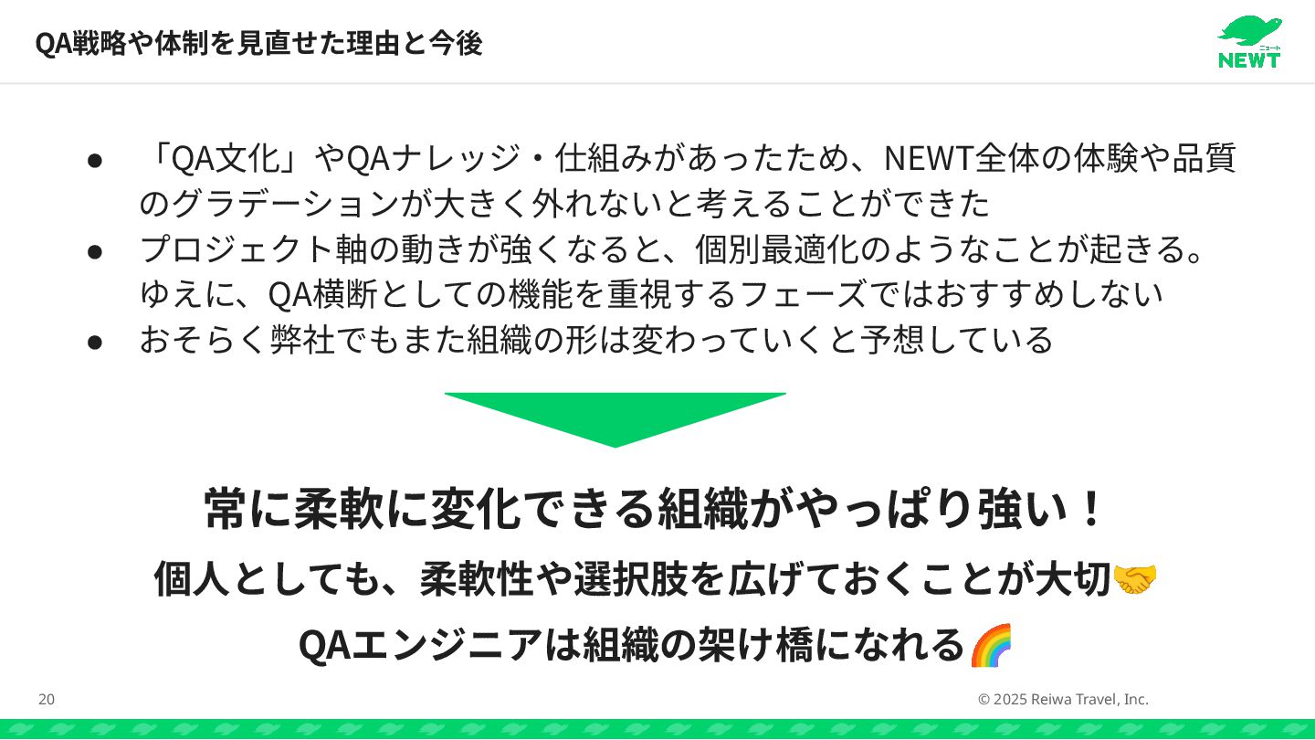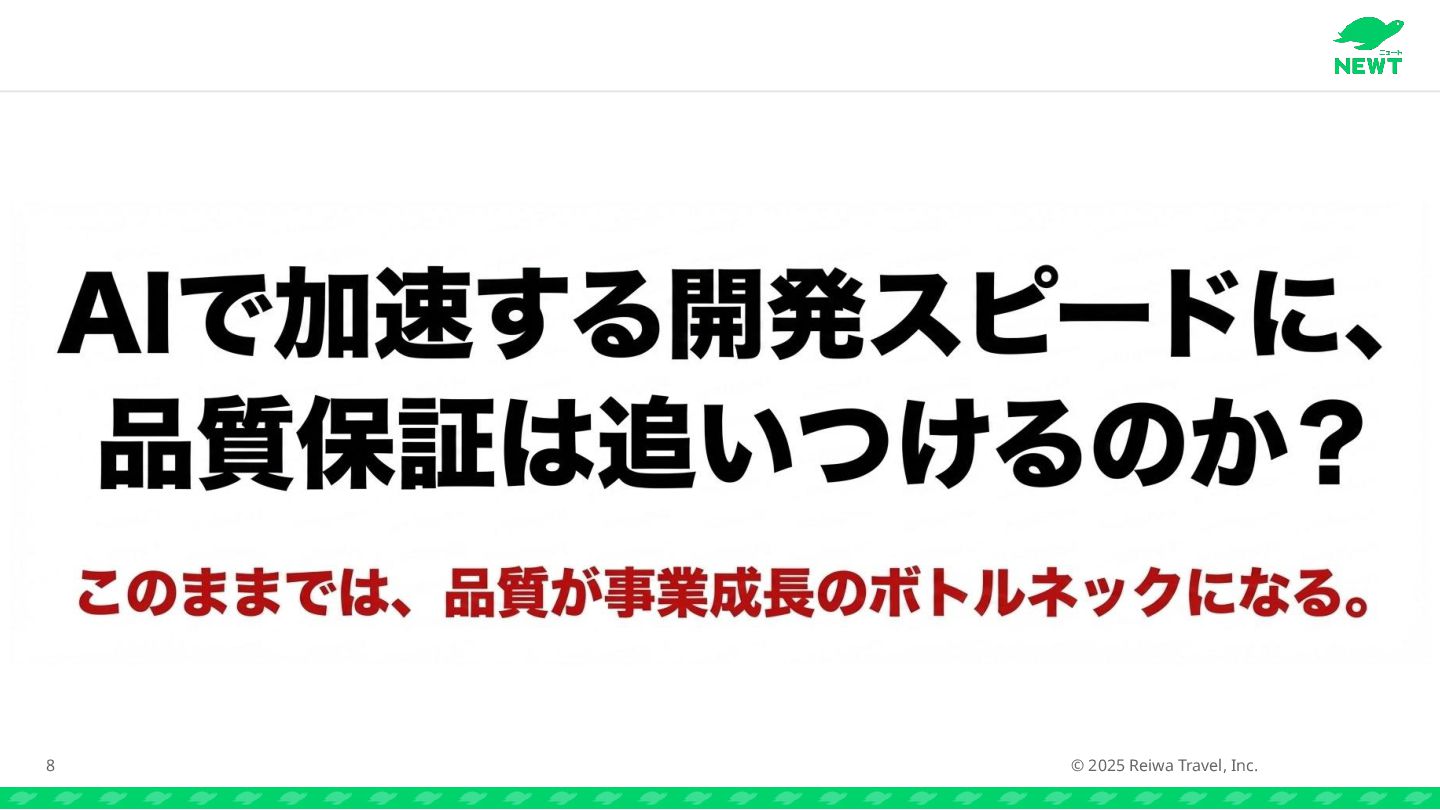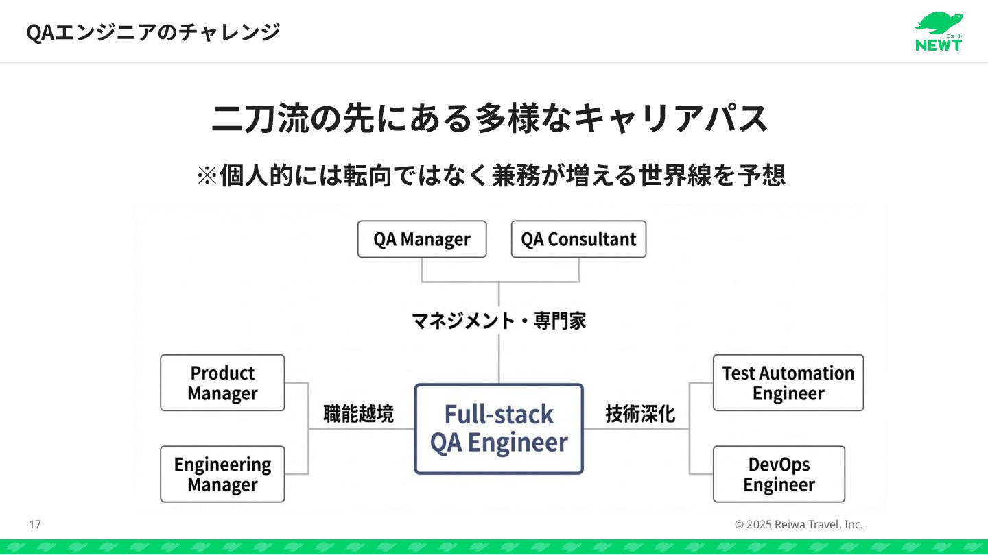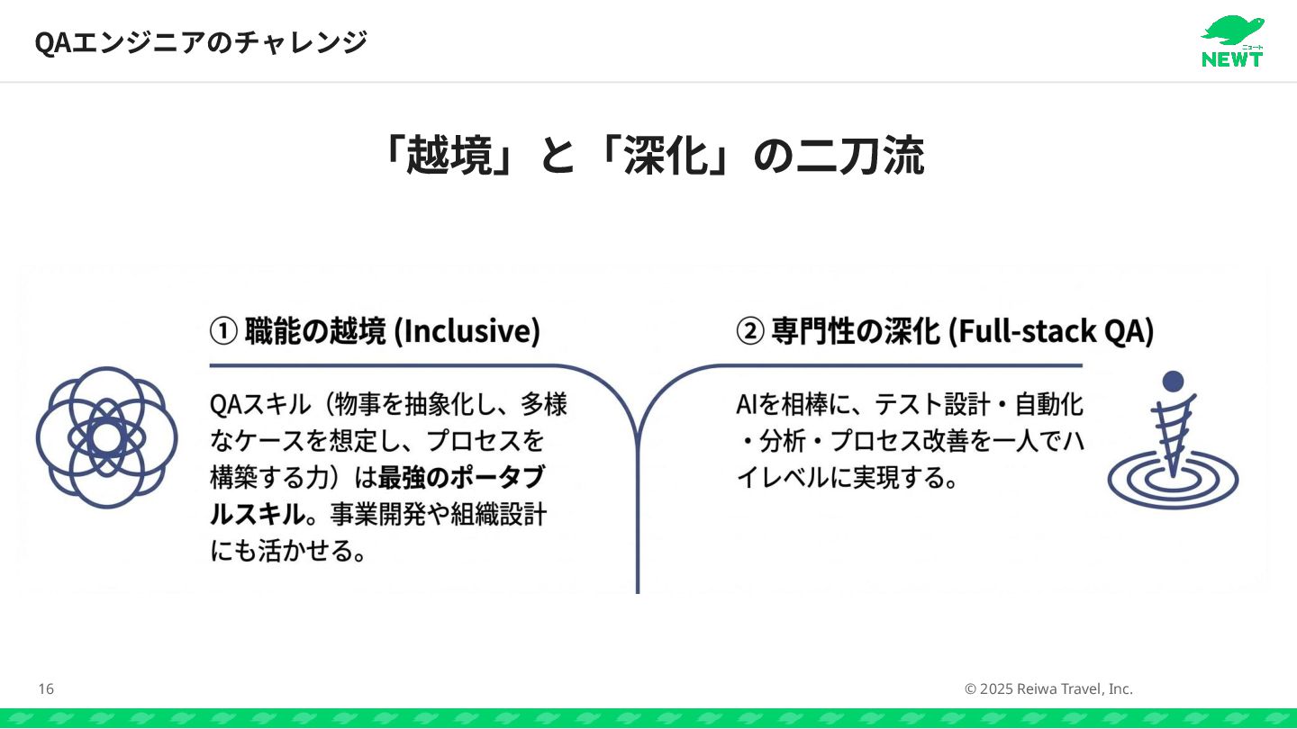 ▼概要 「AI時代のQAエンジニアの在り方と組織変革」に関するプレゼンテーション資料です。 ・体制のフルスタック化 ・権限移譲の拡大: ・ミッションの明確化 ・QAエンジニアが目指す「二刀流」のキャリア