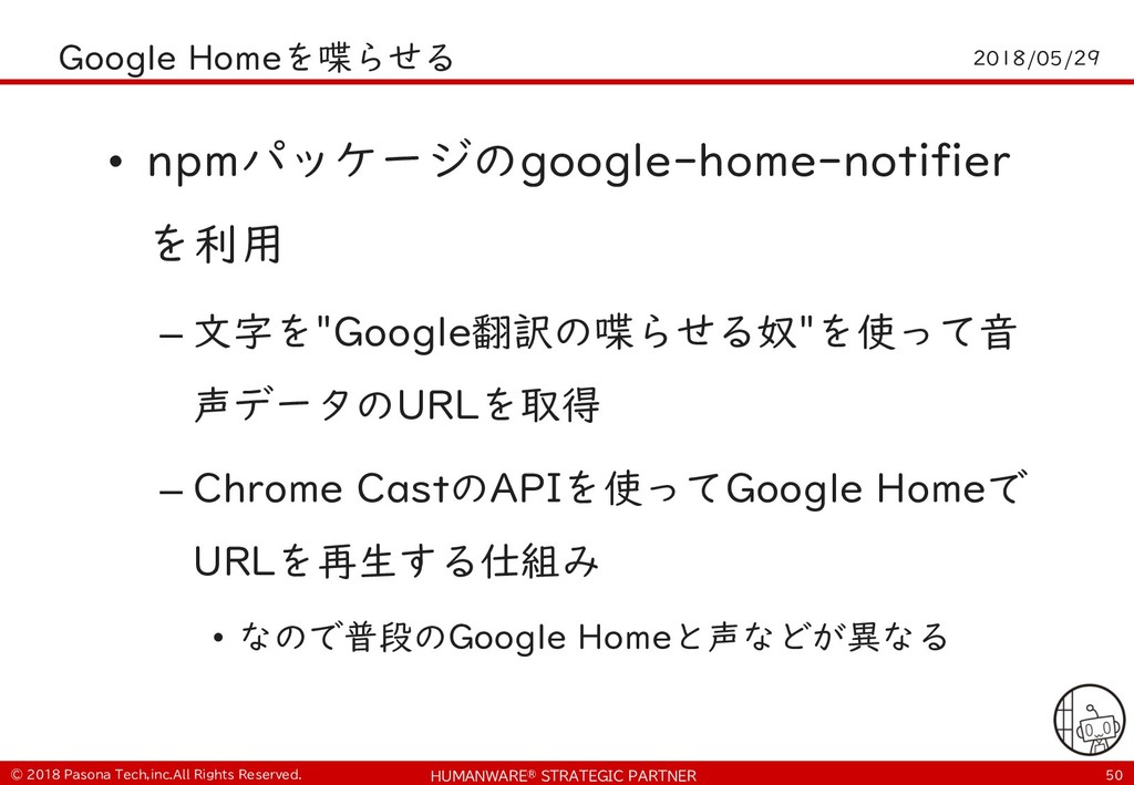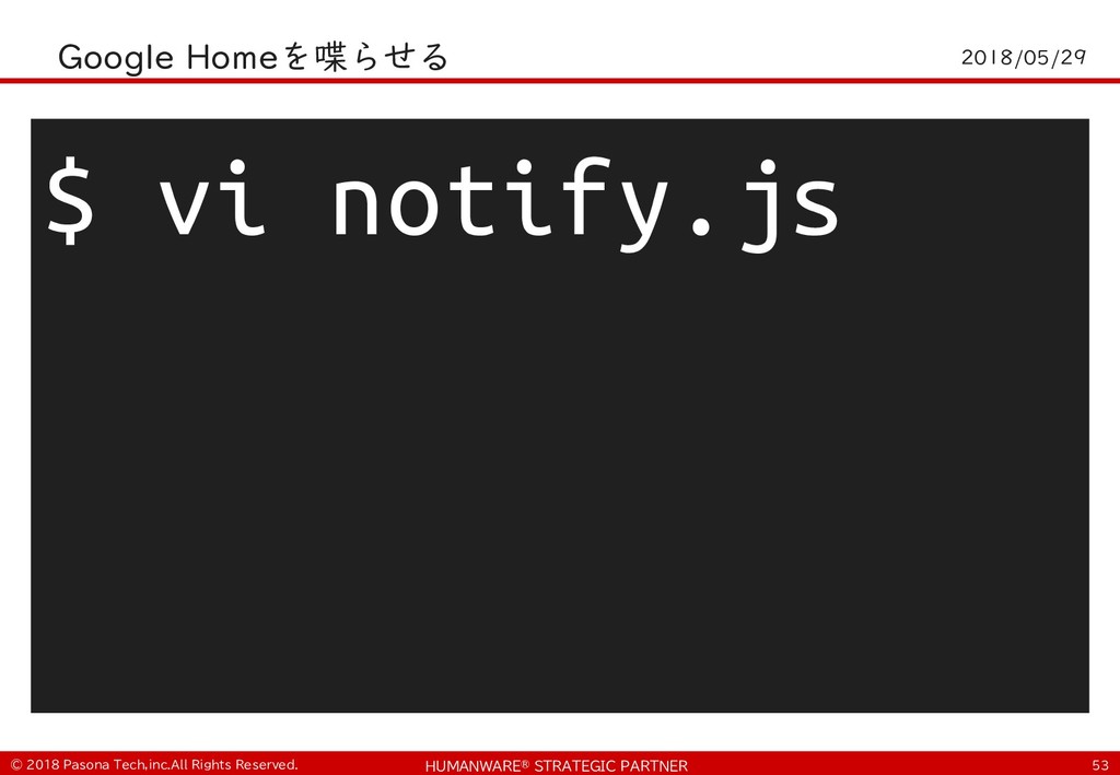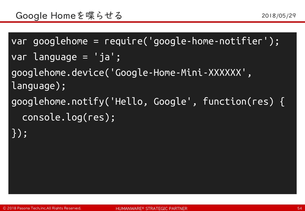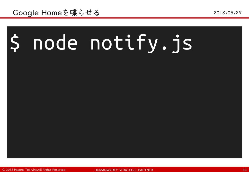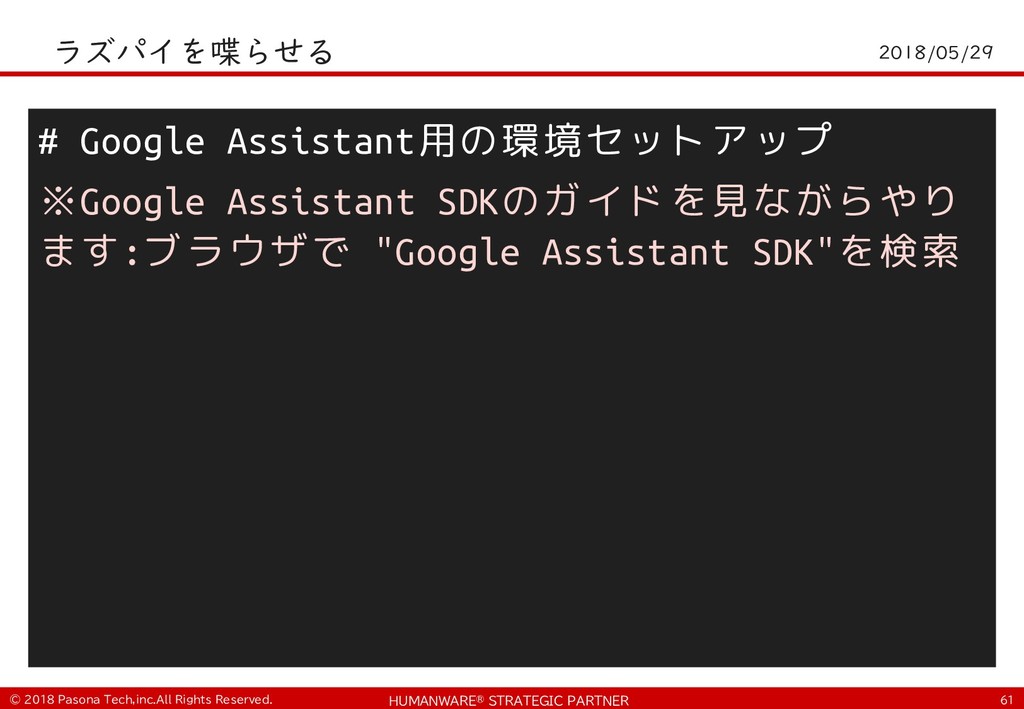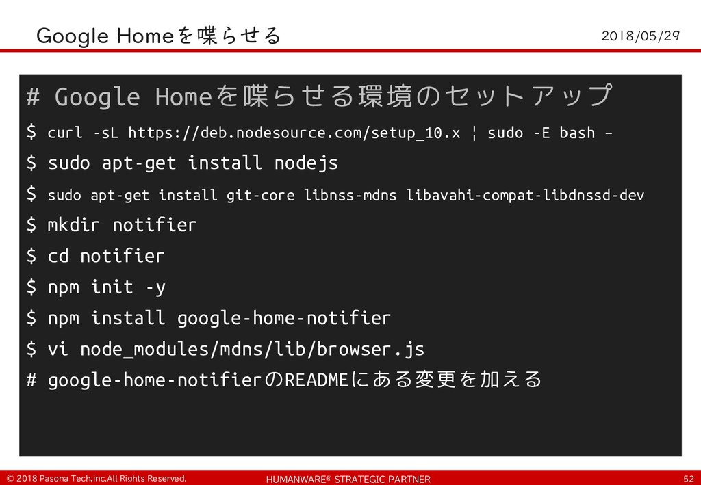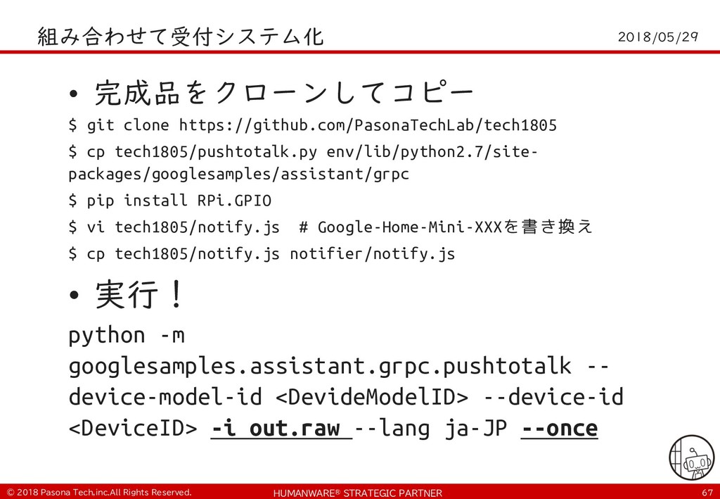 • $ git clone https://github.com/PasonaTechLab/tech1805 $ cp tech1805/pushtotalk.py env/lib/python2.7/site- packages/googlesamples/assistant/grpc $ pip install RPi.GPIO $ vi tech1805/notify.js # Google-Home-Mini-XXXを書き換え $ cp tech1805/notify.js notifier/notify.js • python -m googlesamples.assistant.grpc.pushtotalk -- device-model-id <DevideModelID> --device-id <DeviceID> -i out.raw --lang ja-JP --once ! "