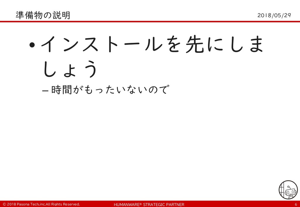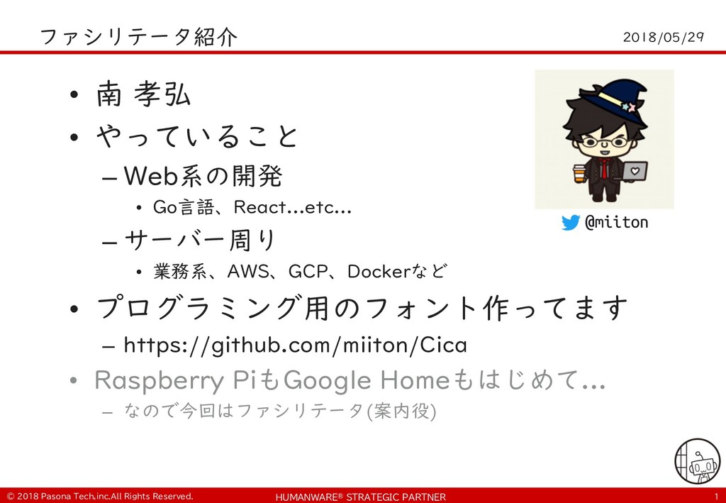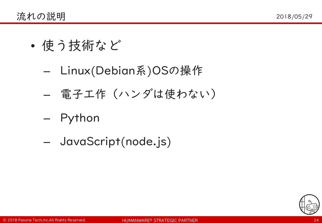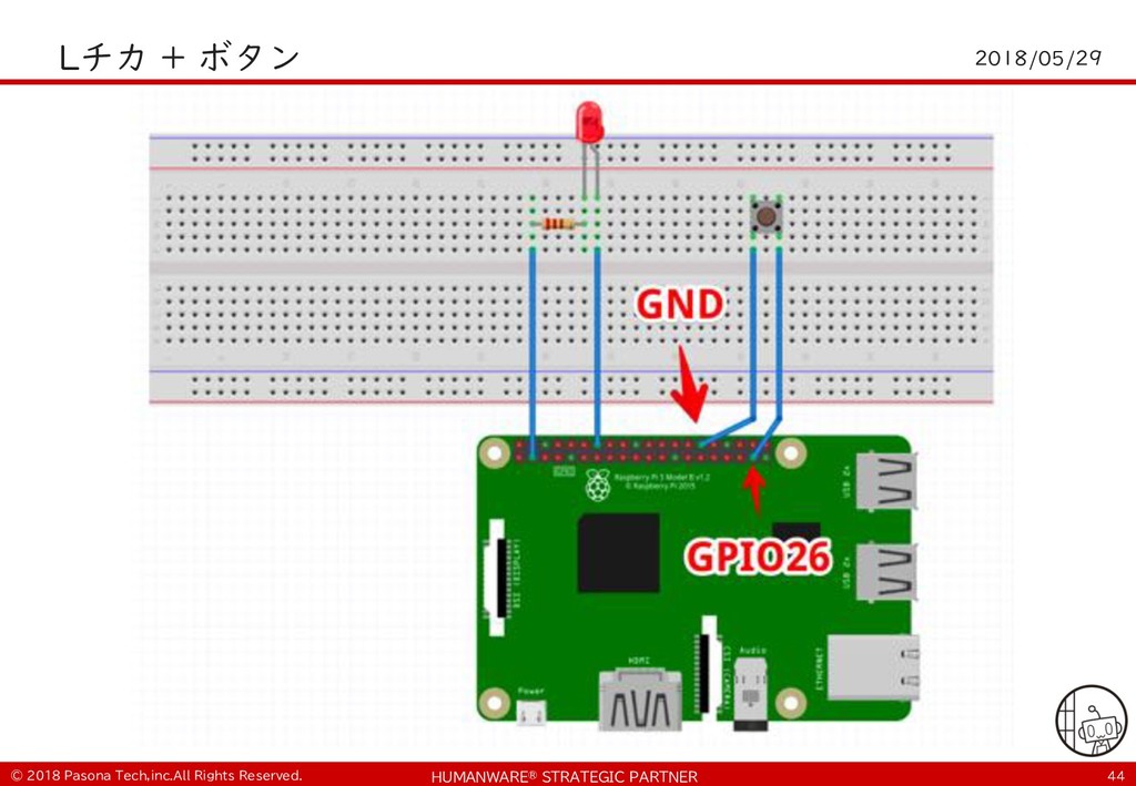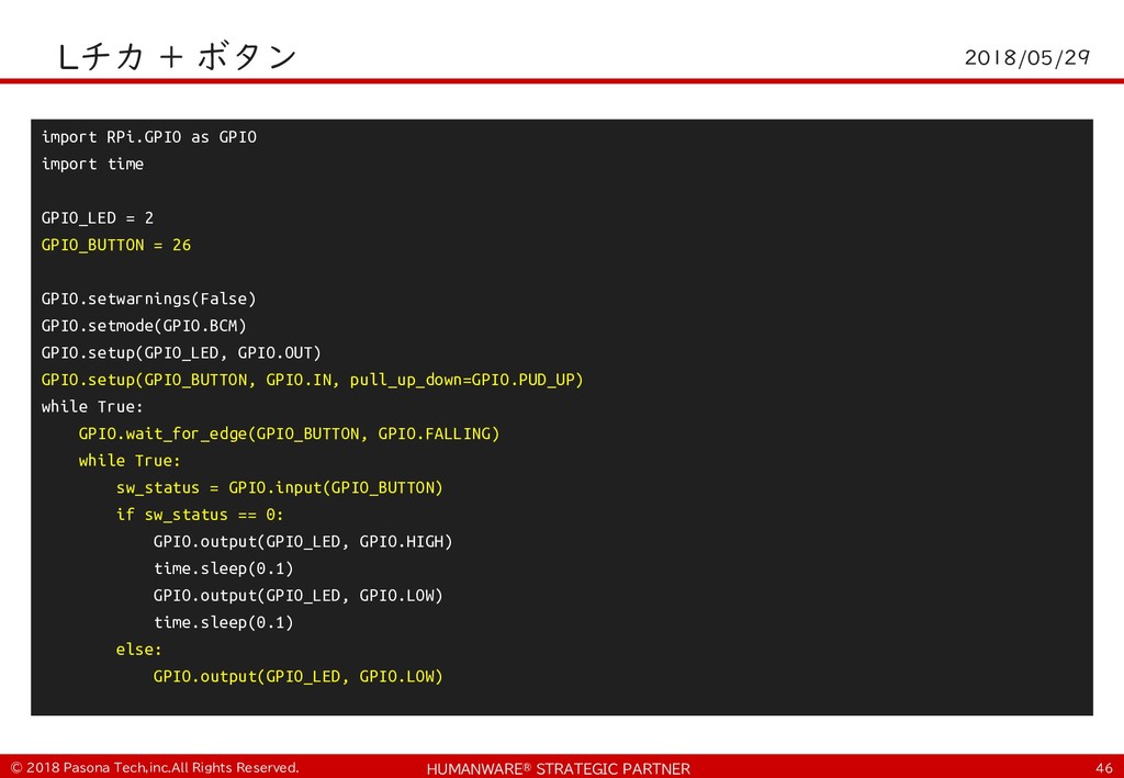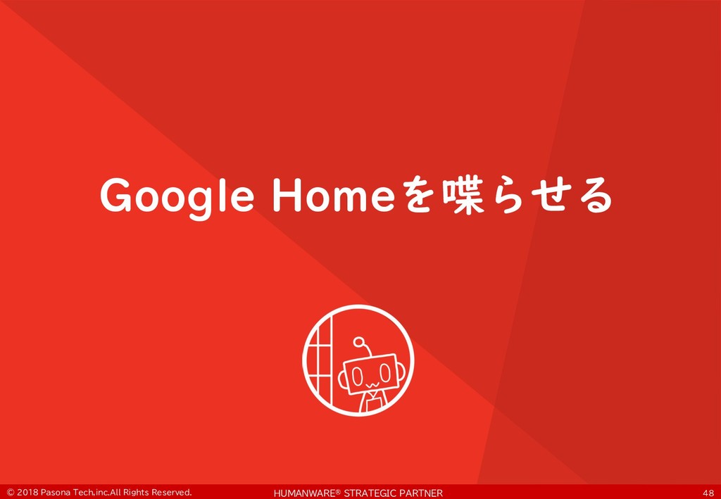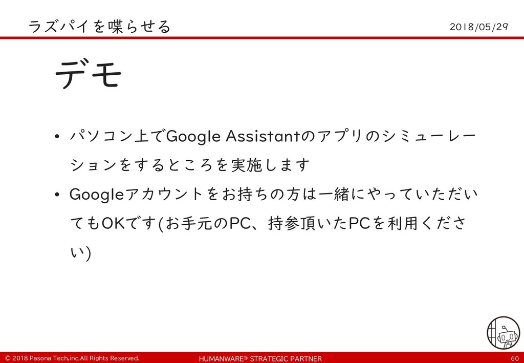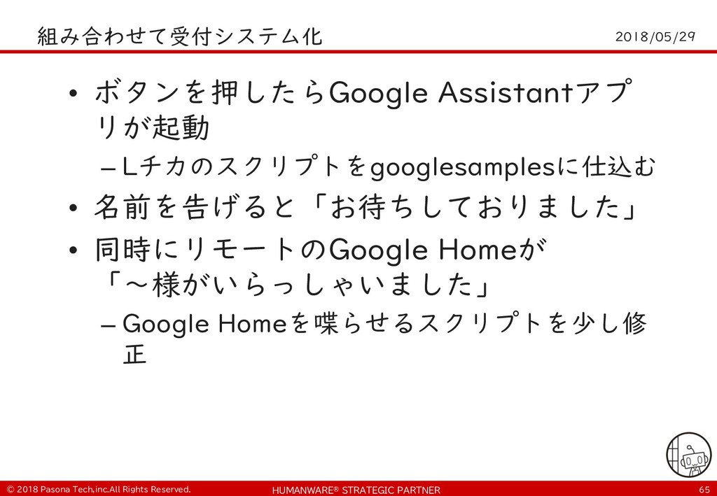 • $ git clone https://github.com/PasonaTechLab/tech1805 $ cp tech1805/pushtotalk.py env/lib/python2.7/site- packages/googlesamples/assistant/grpc $ pip install RPi.GPIO $ vi tech1805/notify.js # Google-Home-Mini-XXXを書き換え $ cp tech1805/notify.js notifier/notify.js • python -m googlesamples.assistant.grpc.pushtotalk -- device-model-id <DevideModelID> --device-id <DeviceID> -i out.raw --lang ja-JP --once ! "