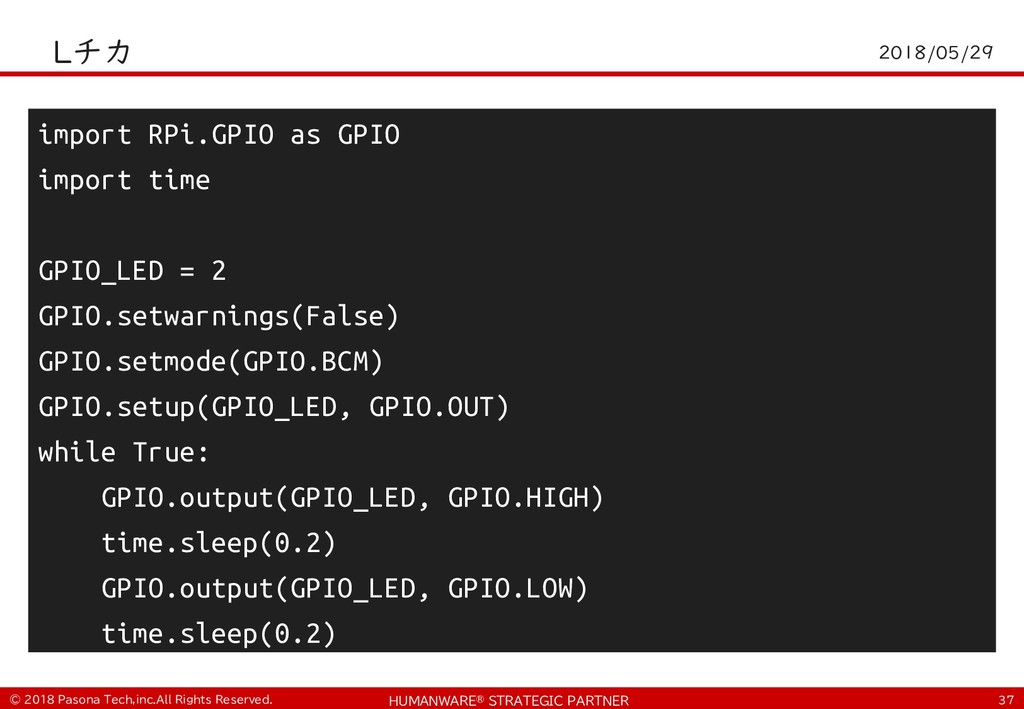 import RPi.GPIO as GPIO import time GPIO_LED = 2 GPIO.setwarnings(False) GPIO.setmode(GPIO.BCM) GPIO.setup(GPIO_LED, GPIO.OUT) while True: GPIO.output(GPIO_LED, GPIO.HIGH) time.sleep(0.2) GPIO.output(GPIO_LED, GPIO.LOW) time.sleep(0.2)