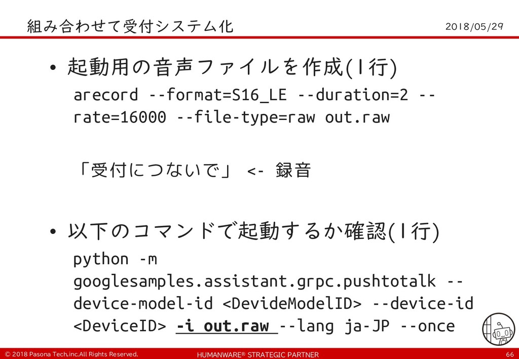 !% • #& (,) arecord --format=S16_LE --duration=2 -- rate=16000 --file-type=raw out.raw 「受付につないで」 <- 録音 • $'"(,) python -m googlesamples.assistant.grpc.pushtotalk -- device-model-id <DevideModelID> --device-id <DeviceID> -i out.raw --lang ja-JP --once -+,/*+.*-0