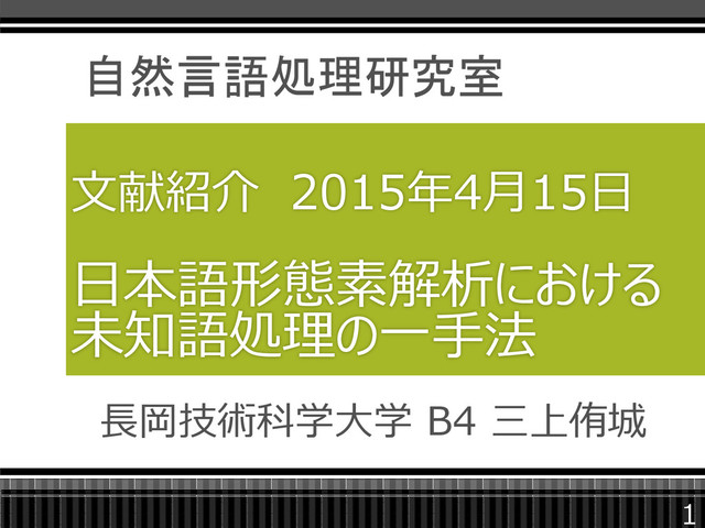 長岡技術科学大学 B4 三上侑城 文献紹介 2015年4月15日 日本語形態素解析における 未知語処理の一手法 自然言語処理研究室 1
