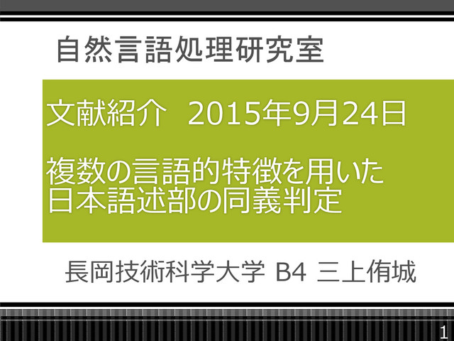長岡技術科学大学 B4 三上侑城 文献紹介 2015年9月24日 複数の言語的特徴を用いた 日本語述部の同義判定 自然言語処理研究室 1