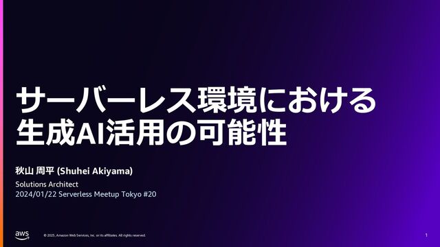 rights reserved. サーバーレス環境における ⽣成AI活⽤の可能性 秋⼭ 周平 (Shuhei Akiyama) Solutions Architect 2024/01/22 Serverless Meetup Tokyo #20 1