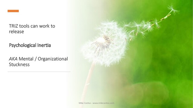 model) of the solution or root cause. 2.False assumptions (trusting the data). 3.Language that is a strong carrier of psychological inertia. Specific terminology carries psychological inertia. 4.Experience, expertise and reliance upon previous results. 5.Limited knowledge, hidden resources or mechanisms. 6.Inflexibility (model worship; trying to prove a specific theory, stubbornness). 7.Using the same strategy. Keep thinking the same way and you will continue to get the same result. 8.Rushing to a solution – incomplete thinking. 12 Mike Cardus - www.mikecardus.com