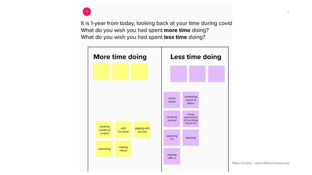 been playing on social media I start drinking too much alcohol I compare myself to others I feel I’ve been watching too much TV Then stuff you want to do more of; I will play with my kids I will write an article I will exercise or take a walk I will record video or create webinar content For some amount of time; 30-60 minutes 30-45 minutes 30+ minutes 60 – 90 minutes Mike Cardus :: www.MikeCardus.com 5