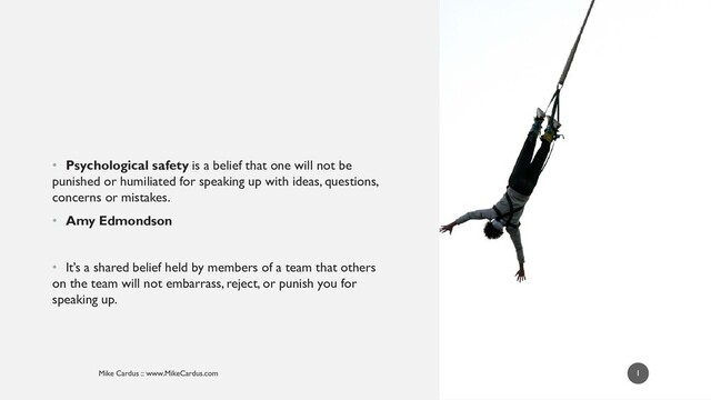 be punished or humiliated for speaking up with ideas, questions, concerns or mistakes. • Amy Edmondson • It’s a shared belief held by members of a team that others on the team will not embarrass, reject, or punish you for speaking up. 1