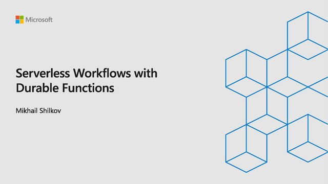 In this talk, Mikhail will demonstrate how Durable Functions combine Azure Functions and durable storage to implement workflows in the cloud. The toolbox includes "fan-in fan-out" pattern, waiting for external events and human interaction, error handling, retries and timeouts, and more.