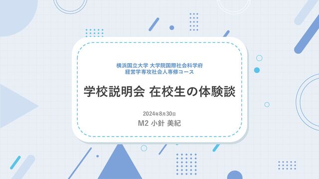 横浜国立大学 大学院国際社会科学府 経営学専攻社会人専修コース 学校説明会 在校生の体験談 2024年8月30日 M2 小針 美紀