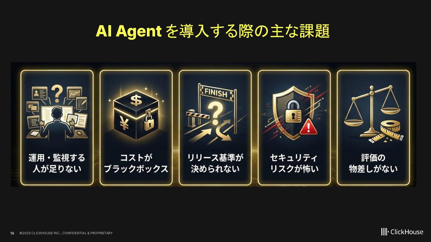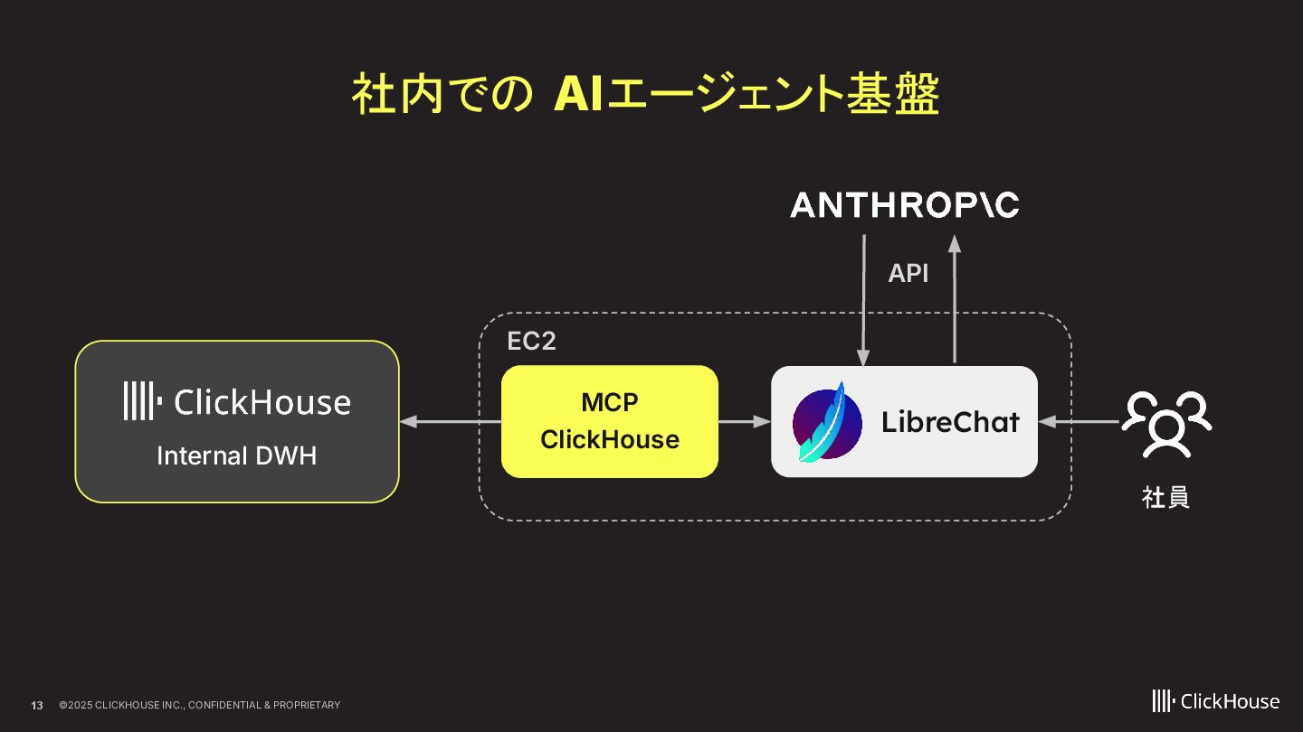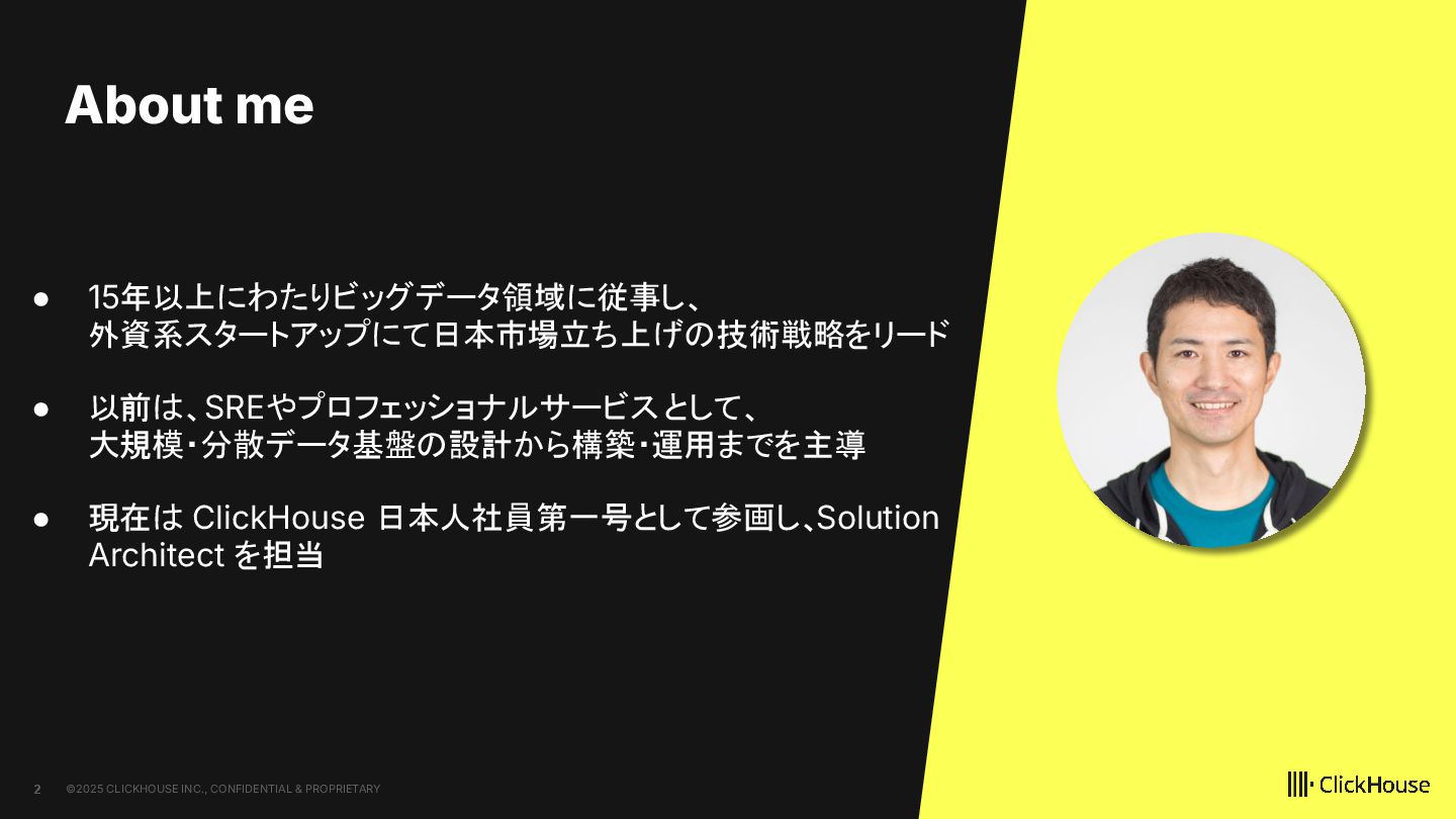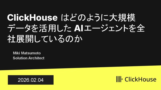 ClickHouseが、大規模データを活用したAIエージェントをどのように全社展開しているのか、その仕組みを解説します。 ClickHouseでは、顧客情報、障害情報、ClickHouse CloudのObservabilityデータなど、大規模かつ多様なデータを横断的に活用し、経営者・営業・サポートといった、ほぼすべてのロールがAIエージェントを日常的に利用しています。 本LTでは、こうした取り組みを支えるアーキテクチャを踏まえながら、AIエージェントをどのように全社へ展開しているのかを、デモを交えて紹介します。