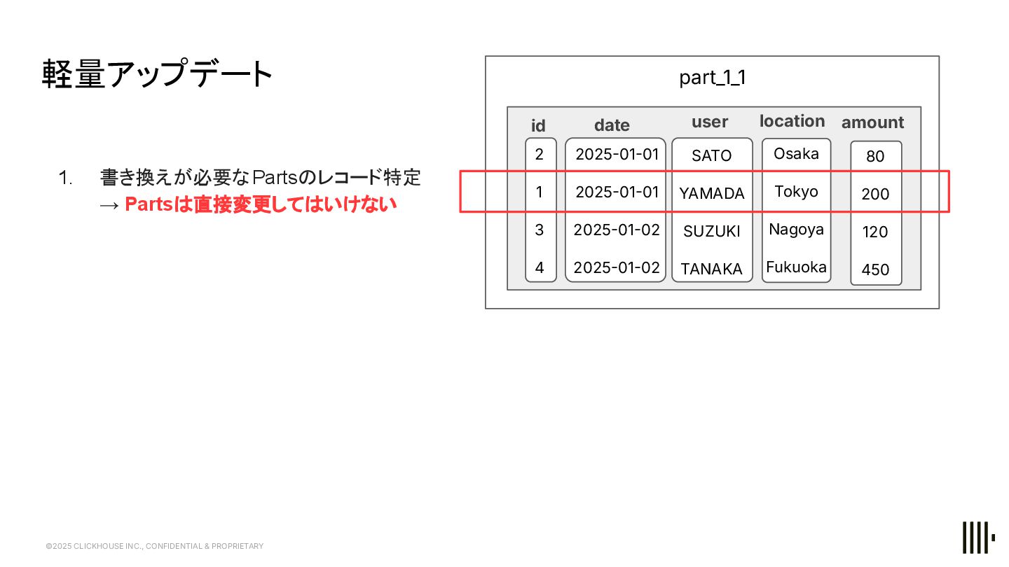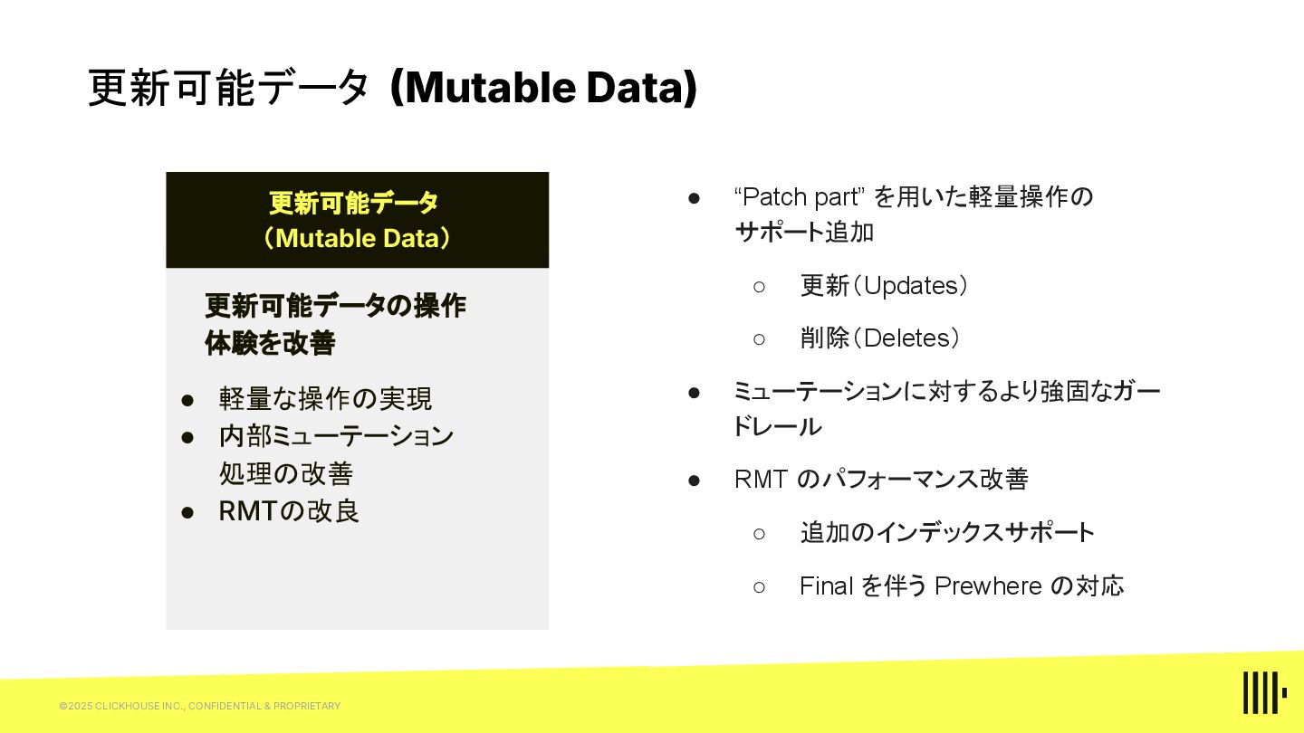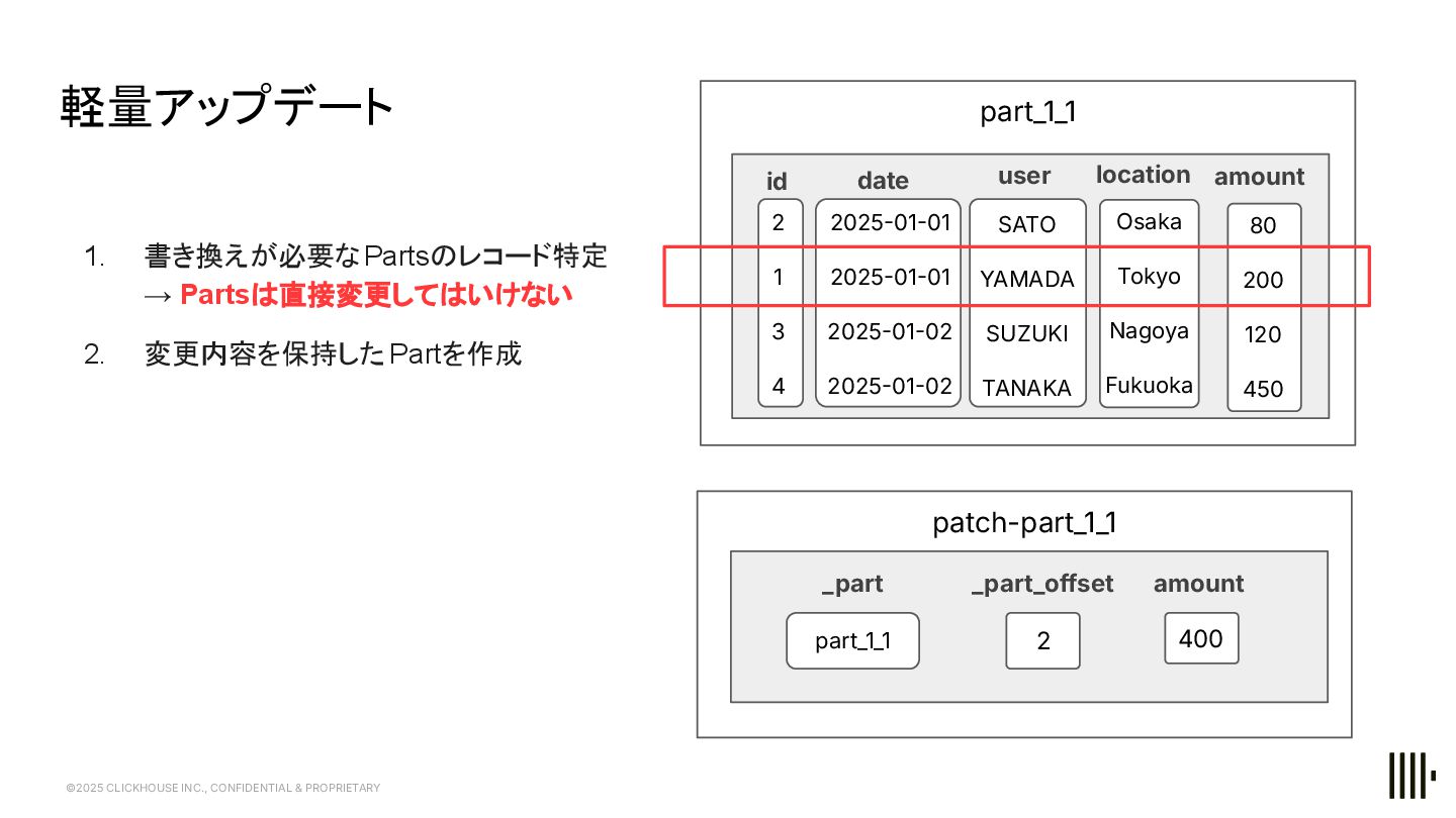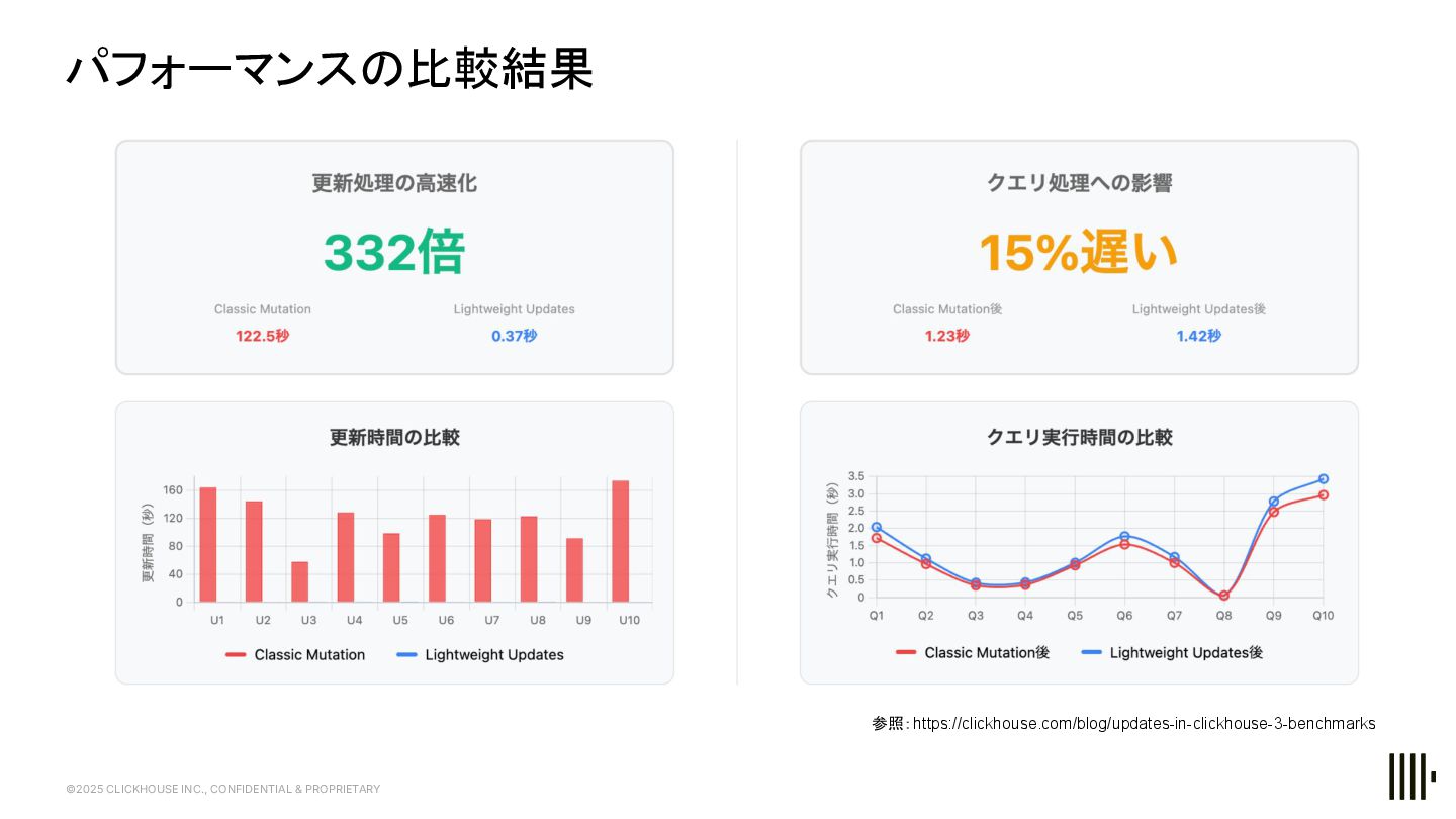従来はデータ更新にコストがかかるケースが多かった ClickHouse において、効率的かつ直感的にデータ更新を行えるようになったこの機能は、多くの利用シーンで実用的であり、理解しやすいように丁寧に仕組みと活用例を解説しました。
