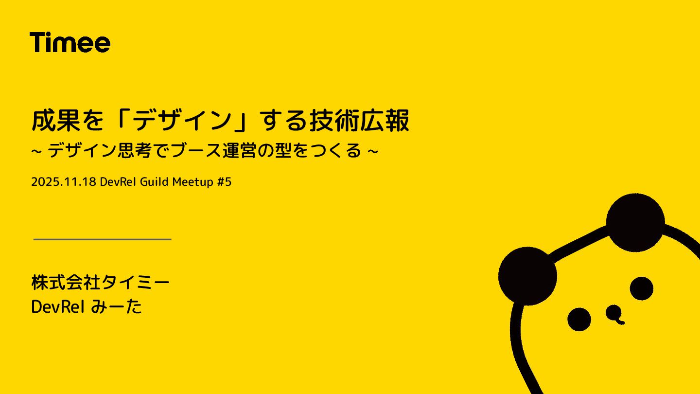 株式会社タイミー DevRel みーた 成果を「デザイン」する技術広報 ~ デザイン思考でブース運営の型をつくる ~ 2025.11.18 DevRel Guild
