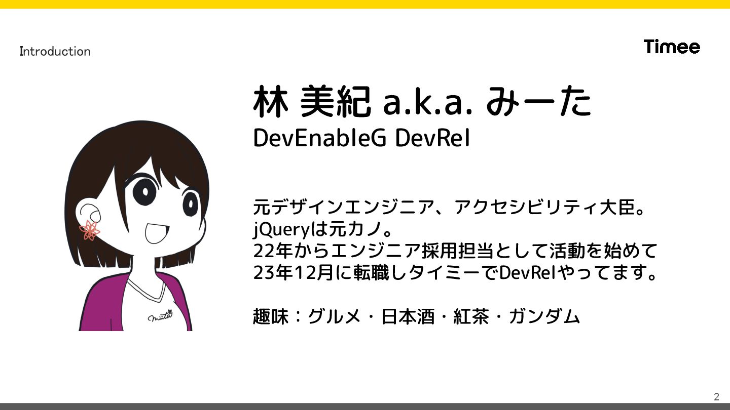 2 林 美紀 a.k.a. みーた DevEnableG DevRel 元デザインエンジニア、アクセシビリティ大臣。 jQueryは元カノ。 22年からエンジニア採用担当として活動を始めて
