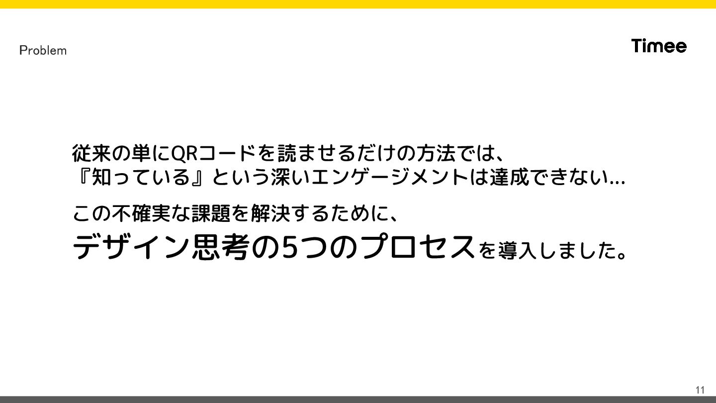 Problem 従来の単にQRコードを読ませるだけの方法では、 『知っている』という深いエンゲージメントは達成できない... 11 この不確実な課題を解決するために、 デザイン思考の5つのプロセスを導入しました。