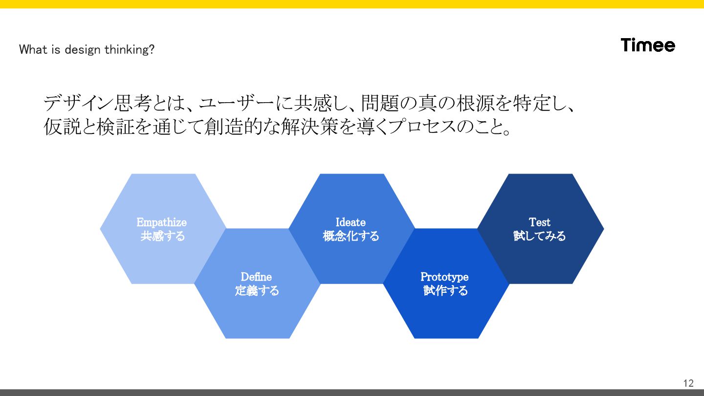 What is design thinking? デザイン思考とは、ユーザーに共感し、問題の真の根源を特定し、 仮説と検証を通じて創造的な解決策を導くプロセスのこと。 12 Empathize