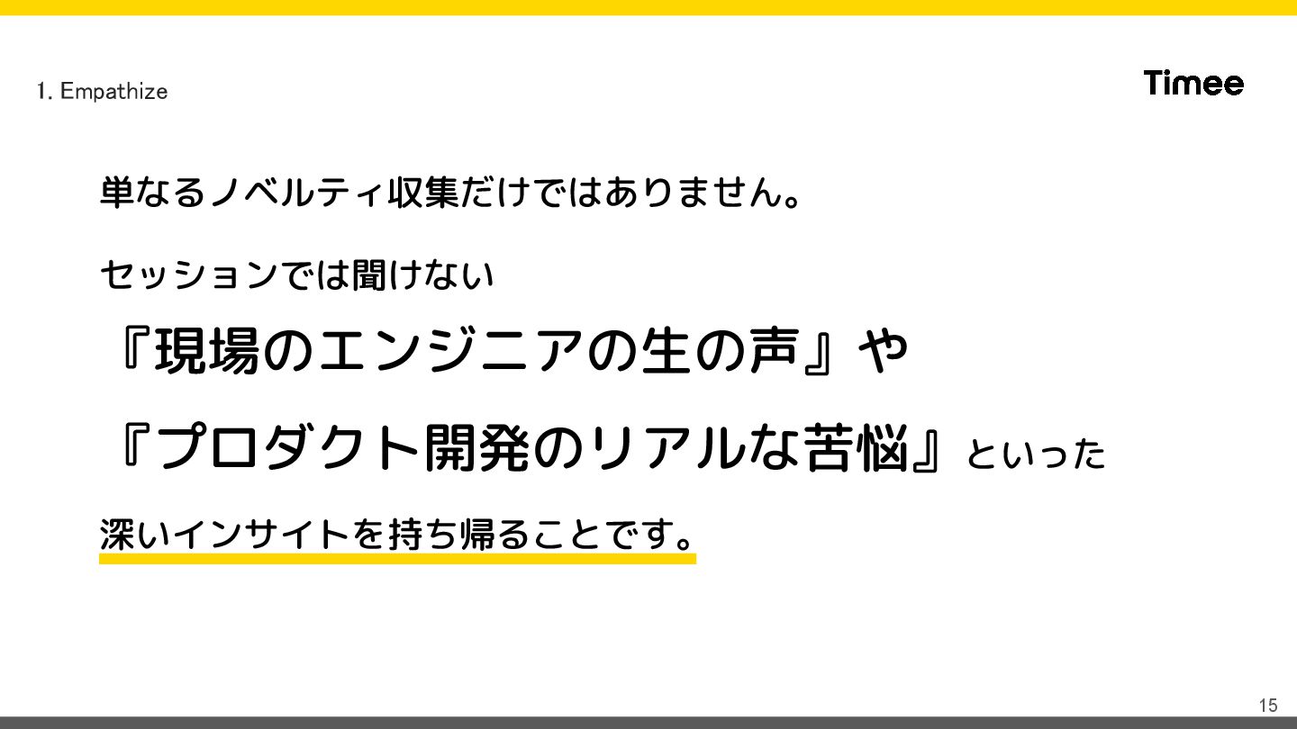1. Empathize セッションでは聞けない 『現場のエンジニアの生の声』や 『プロダクト開発のリアルな苦悩』といった 深いインサイトを持ち帰ることです。 15 単なるノベルティ収集だけではありません。