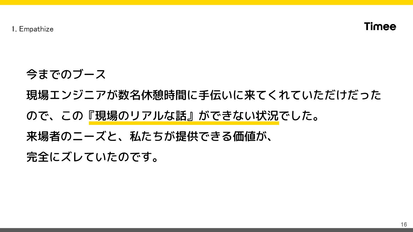 1. Empathize 今までのブース 現場エンジニアが数名休憩時間に手伝いに来てくれていただけだった ので、この『現場のリアルな話』ができない状況でした。 来場者のニーズと、私たちが提供できる価値が、 完全にズレていたのです。 16