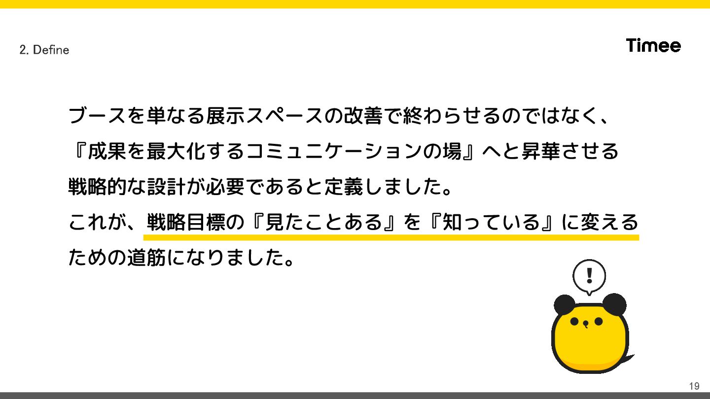 2. Define ブースを単なる展示スペースの改善で終わらせるのではなく、 『成果を最大化するコミュニケーションの場』へと昇華させる 戦略的な設計が必要であると定義しました。 これが、戦略目標の『見たことある』を『知っている』に変える ための道筋になりました。 19