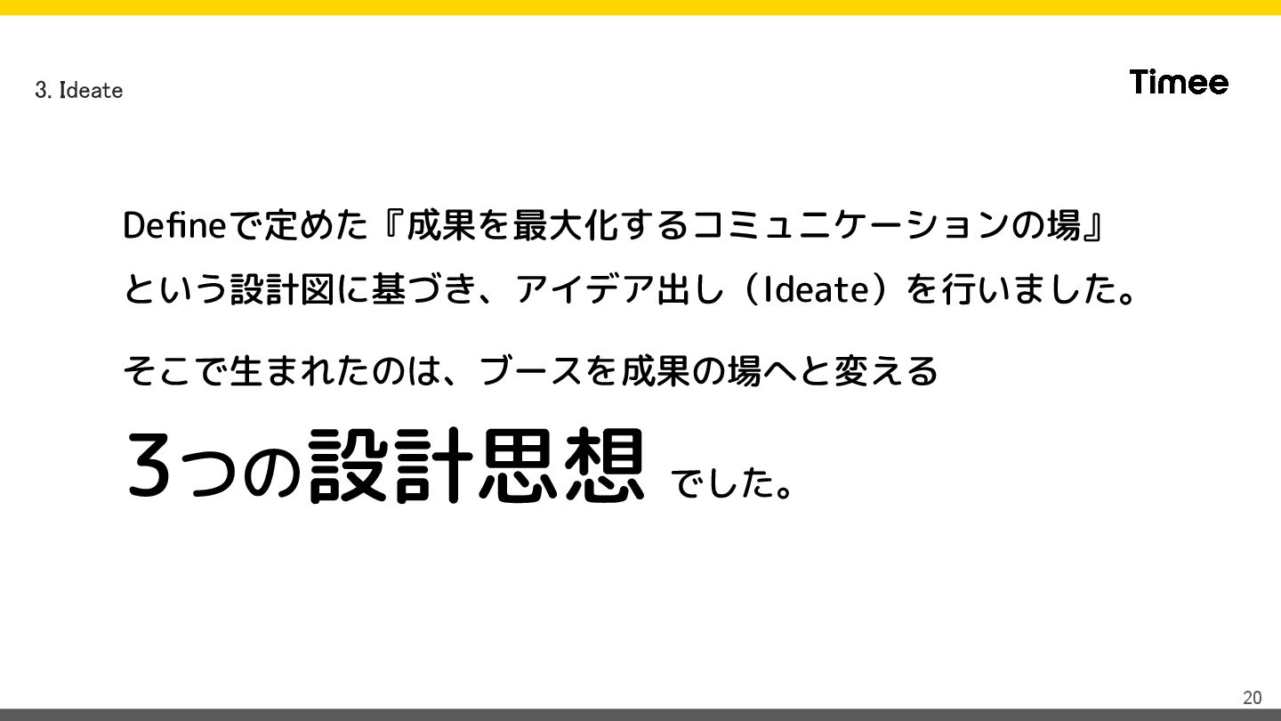 3. Ideate Defineで定めた『成果を最大化するコミュニケーションの場』 という設計図に基づき、アイデア出し(Ideate)を行いました。 20 そこで生まれたのは、ブースを成果の場へと変える 3つの設計思想 でした。