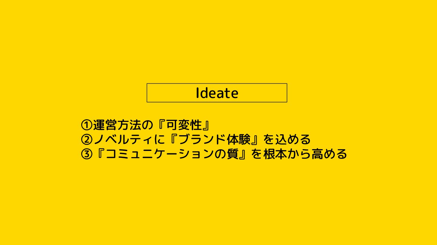 21 ①運営方法の『可変性』 ②ノベルティに『ブランド体験』を込める ③『コミュニケーションの質』を根本から高める Ideate