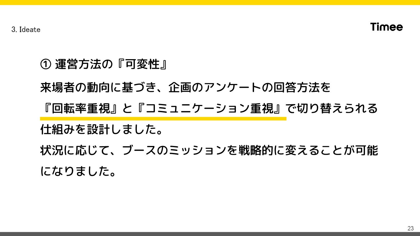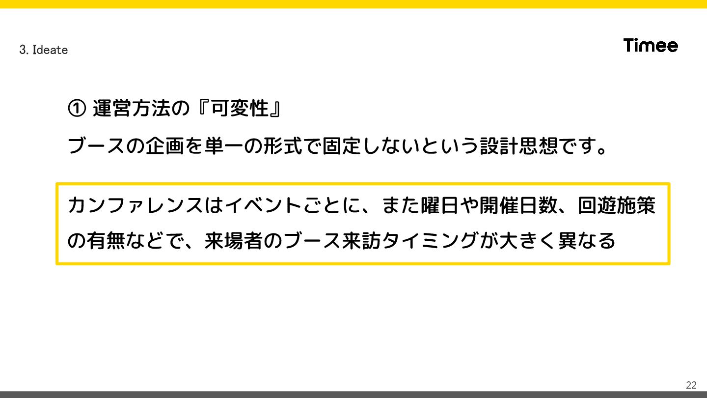 3. Ideate 22 ブースの企画を単一の形式で固定しないという設計思想です。 カンファレンスはイベントごとに、また曜日や開催日数、回遊施策 の有無などで、来場者のブース来訪タイミングが大きく異なる ① 運営方法の『可変性』
