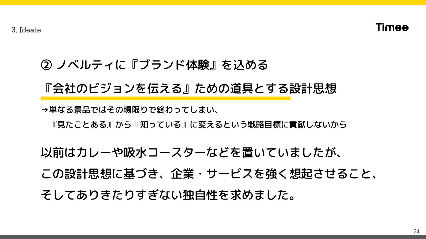 3. Ideate ② ノベルティに『ブランド体験』を込める 24 『会社のビジョンを伝える』ための道具とする設計思想 →単なる景品ではその場限りで終わってしまい、 『見たことある』から『知っている』に変えるという戦略目標に貢献しないから 以前はカレーや吸水コースターなどを置いていましたが、 この設計思想に基づき、企業・サービスを強く想起させること、