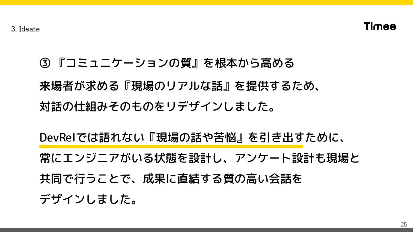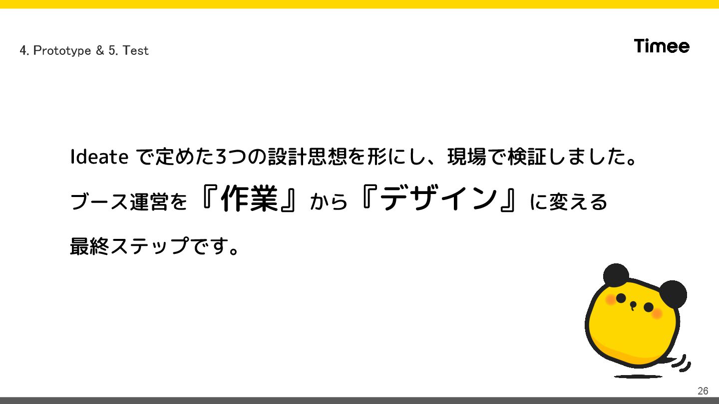3. Ideate ③ 『コミュニケーションの質』を根本から高める 25 来場者が求める『現場のリアルな話』を提供するため、 対話の仕組みそのものをリデザインしました。 DevRelでは語れない『現場の話や苦悩』を引き出すために、 常にエンジニアがいる状態を設計し、アンケート設計も現場と 共同で行うことで、成果に直結する質の高い会話を