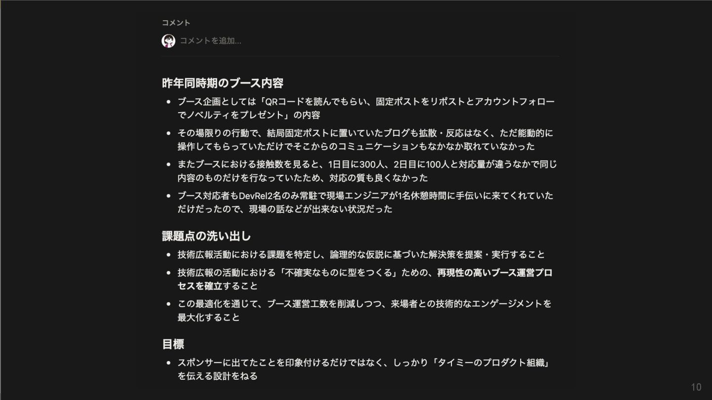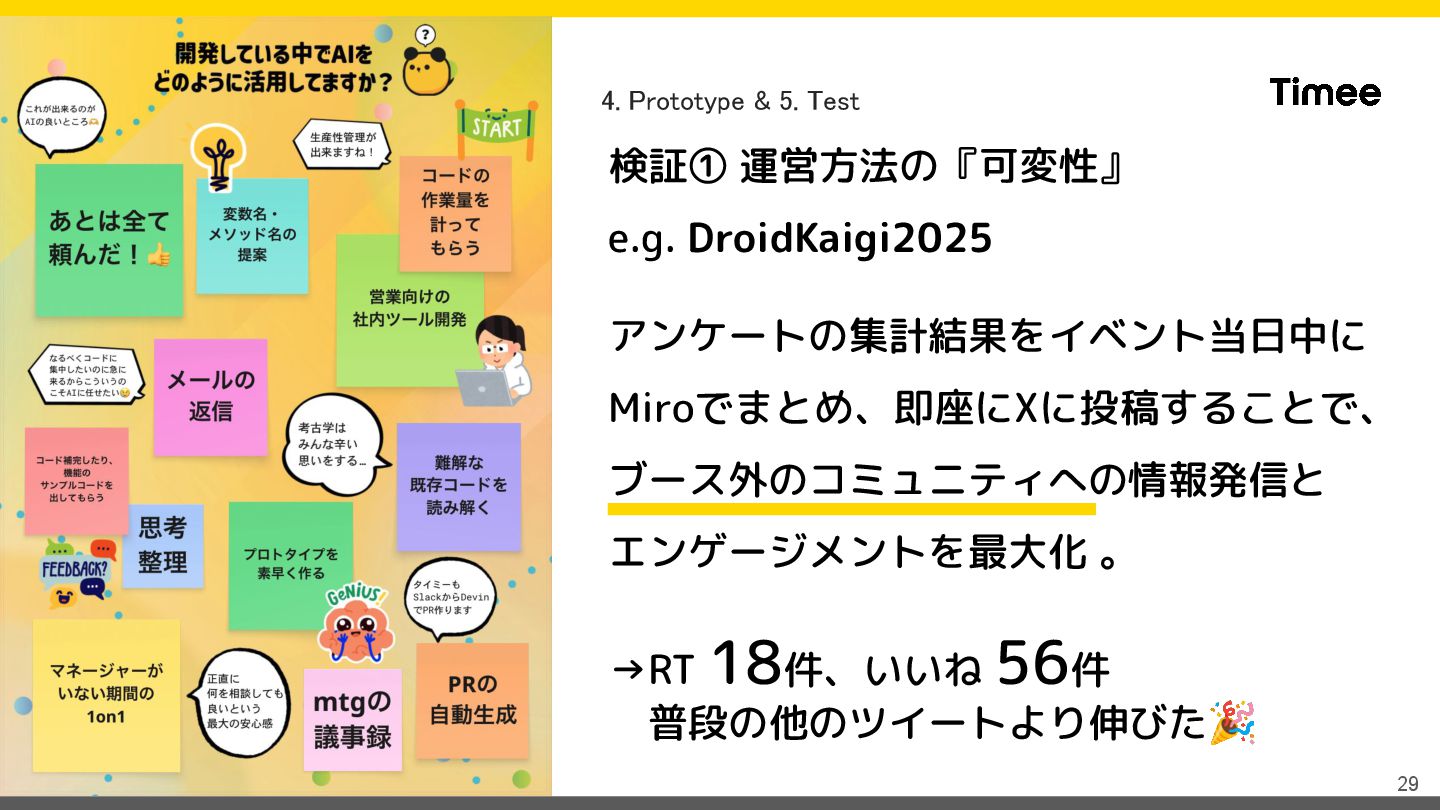 29 アンケートの集計結果をイベント当日中に Miroでまとめ、即座にXに投稿することで、 ブース外のコミュニティへの情報発信と エンゲージメントを最大化 。 →RT 18件、いいね 56件 普段の他のツイートより伸びた🎉