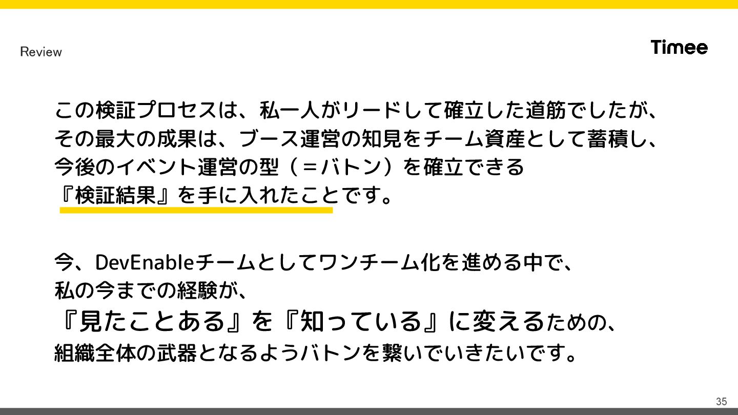 Review 35 この検証プロセスは、私一人がリードして確立した道筋でしたが、 その最大の成果は、ブース運営の知見をチーム資産として蓄積し、 今後のイベント運営の型(=バトン)を確立できる 『検証結果』を手に入れたことです。 今、DevEnableチームとしてワンチーム化を進める中で、 私の今までの経験が、 『見たことある』を『知っている』に変えるための、 組織全体の武器となるようバトンを繋いでいきたいです。