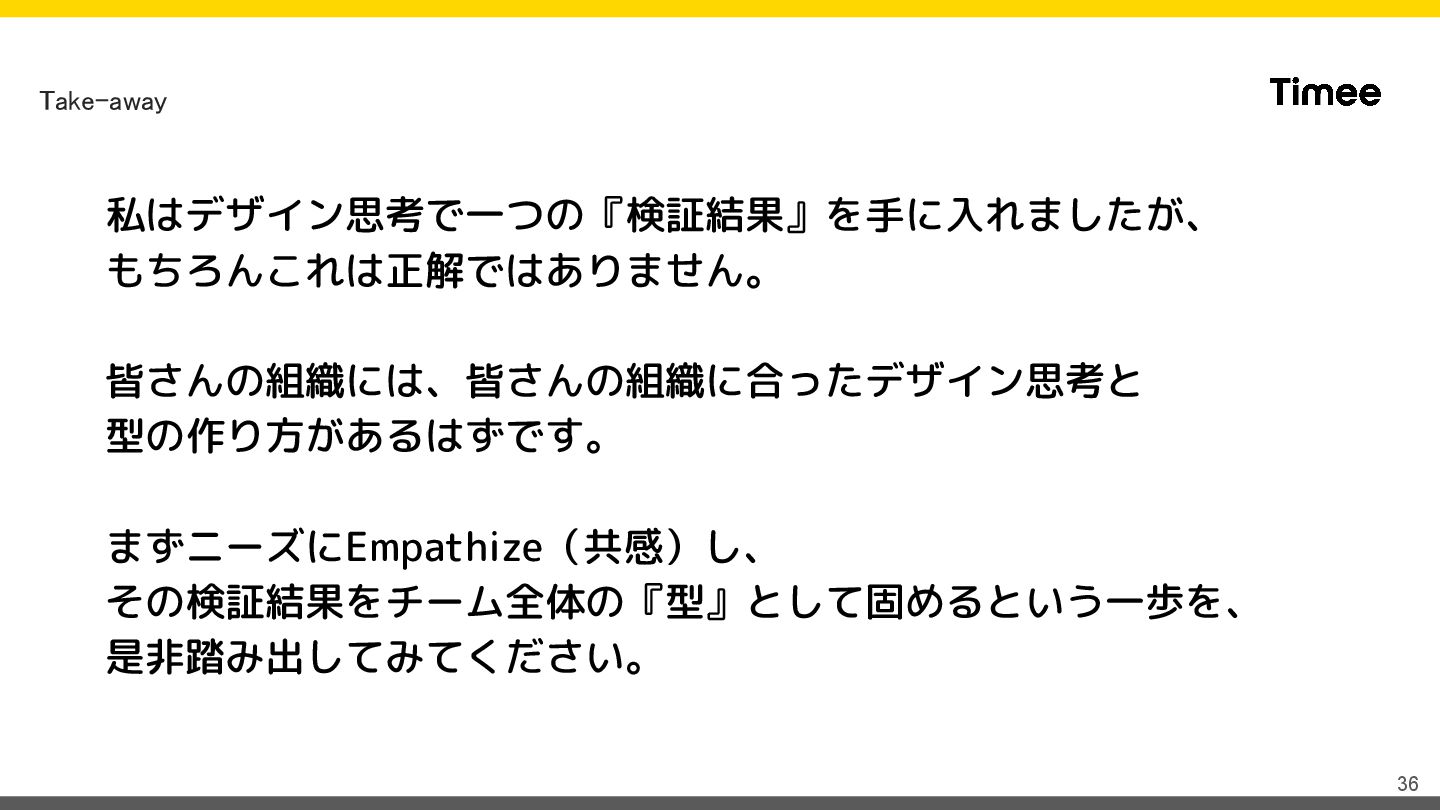 Take-away 36 私はデザイン思考で一つの『検証結果』を手に入れましたが、 もちろんこれは正解ではありません。 皆さんの組織には、皆さんの組織に合ったデザイン思考と 型の作り方があるはずです。 まずニーズにEmpathize(共感)し、 その検証結果をチーム全体の『型』として固めるという一歩を、 是非踏み出してみてください。