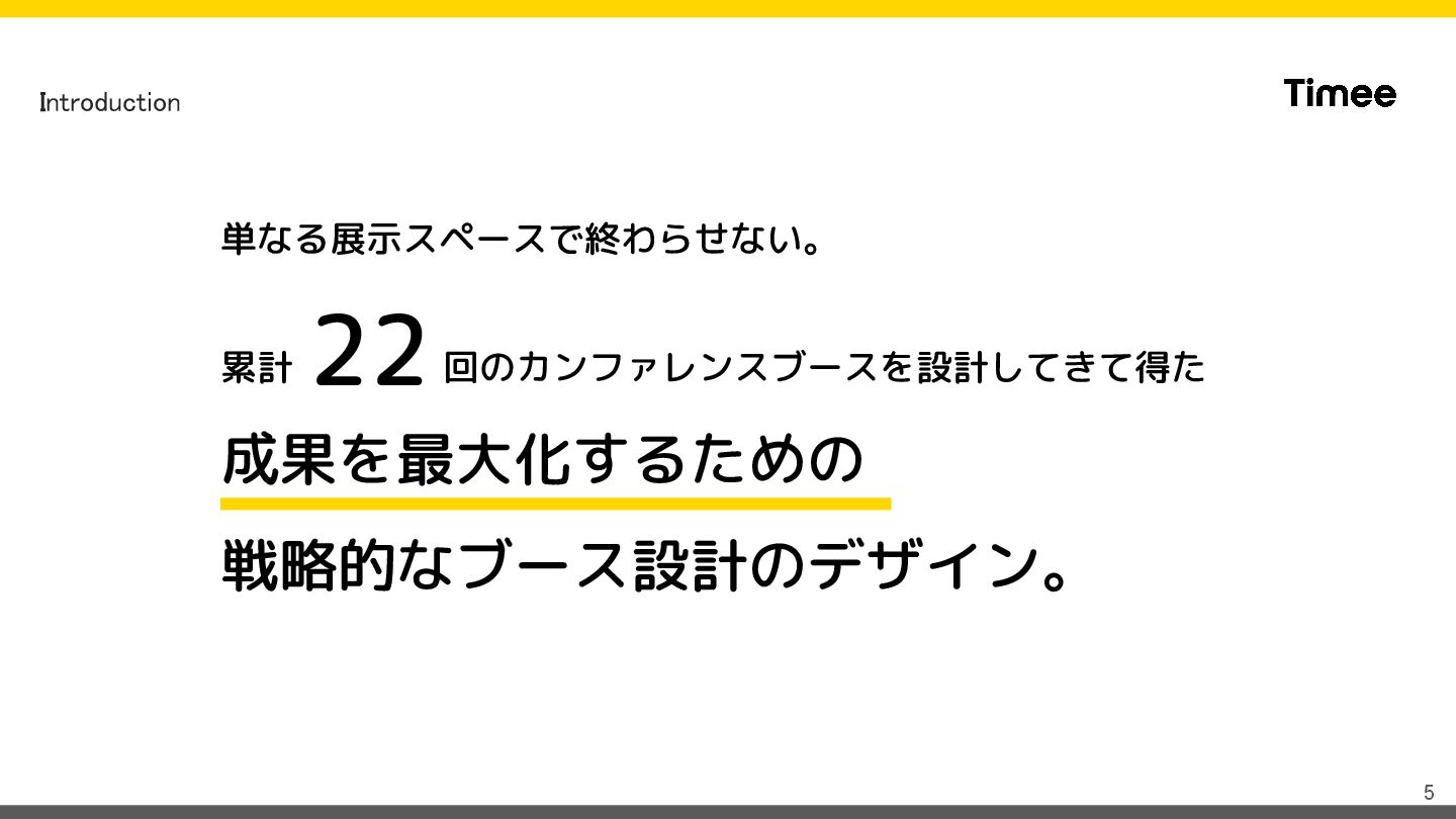 Introduction 単なる展示スペースで終わらせない。 5 22回のカンファレンスブースを設計してきて得た 成果を最大化するための 戦略的なブース設計のデザイン。 累計