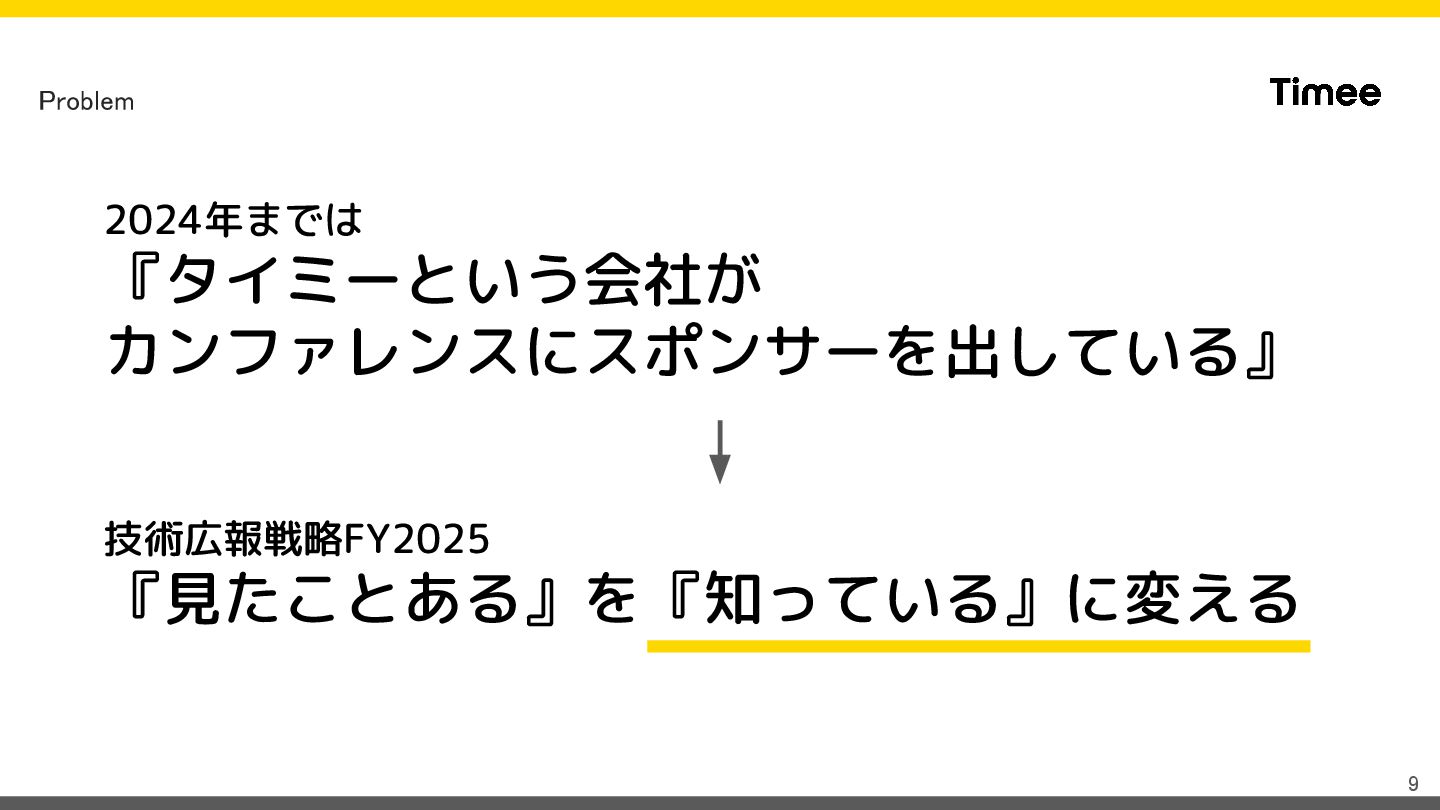 Problem 2024年までは 『タイミーという会社が カンファレンスにスポンサーを出している』 9 技術広報戦略FY2025 『見たことある』を『知っている』に変える