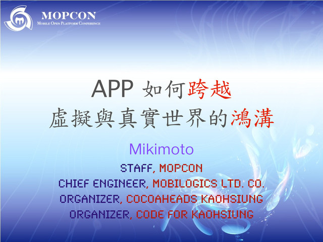 APP 如何跨越 虛擬與真實世界的鴻溝 .JLJNPUP staff, MOPCON Chief Engineer, Mobilogics Ltd.