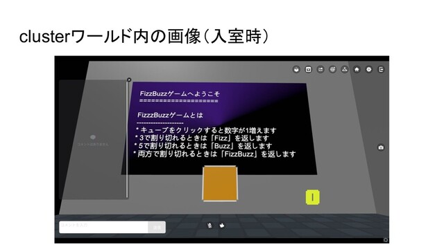 clusterワールド内の画像(キューブクリック後) プレイヤーの画面右下には数字と文字が 常に表示されている ワールド中央のキューブをクリックするごとに 数字が1ずつ加算する FizzBuzzの条件に応じて文字が変わる