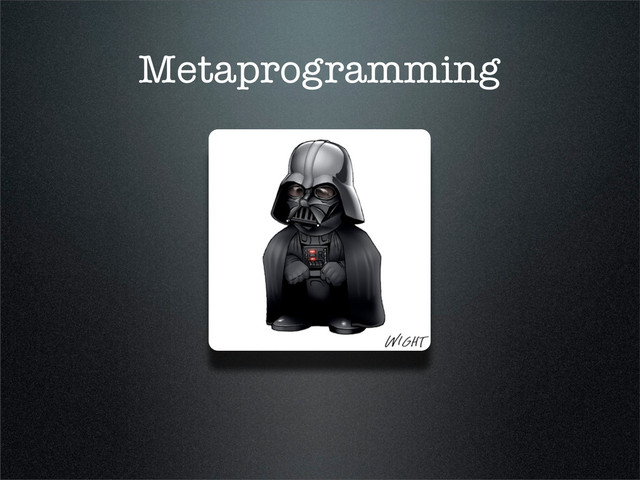 Talk on basic metaprogramming based on presentations given by Dave Thomas at QCon '06 and Patrick Farley at MountainWest RubyConf '08.