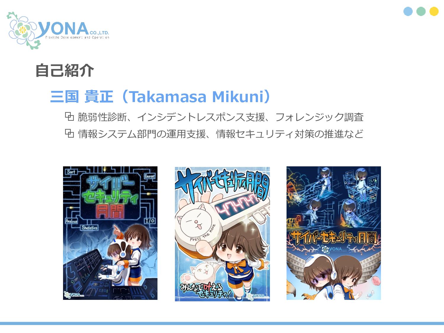 三国 貴正(Takamasa Mikuni) ⧉ 脆弱性診断、インシデントレスポンス支援、フォレンジック調査 ⧉ 情報システム部門の運用支援、情報セキュリティ対策の推進など 自己紹介