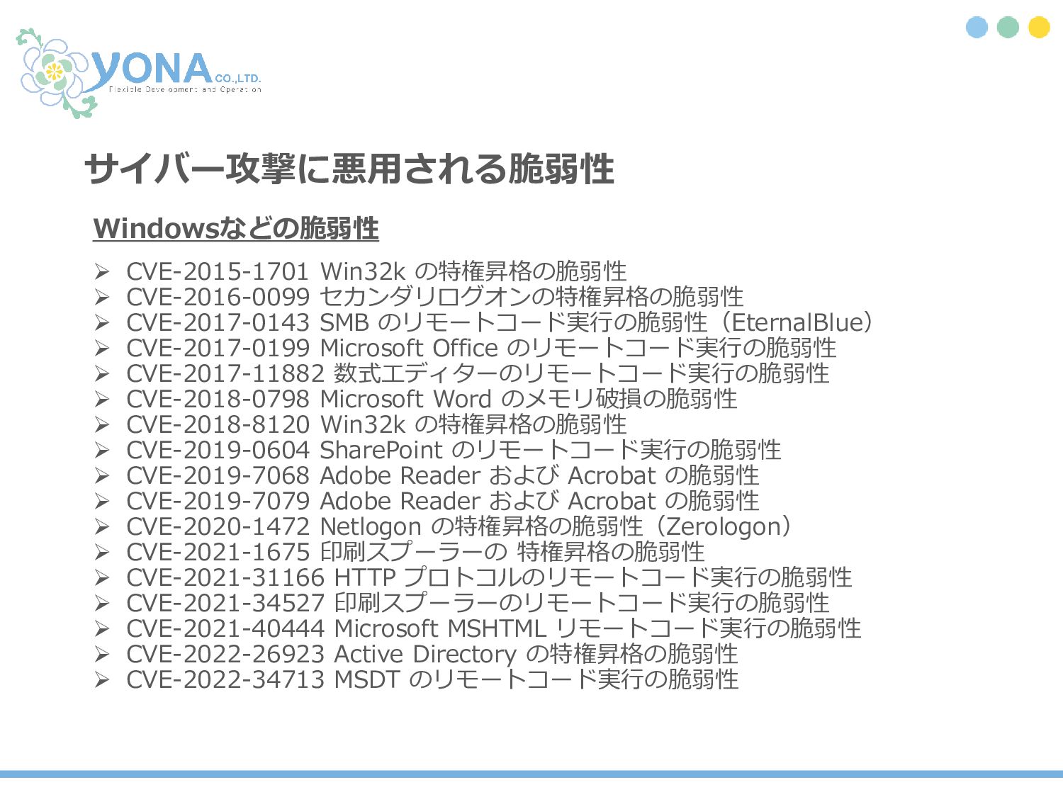CVE-2017-0143 SMB のリモートコード実行の脆弱性(EternalBlue) ➢ CVE-2017-0199 Microsoft Office のリモートコード実行の脆弱性 ➢ CVE-2017-11882 数式エディターのリモートコード実行の脆弱性 ➢ CVE-2018-0798 Microsoft Word のメモリ破損の脆弱性 ➢ CVE-2018-8120 Win32k の特権昇格の脆弱性 ➢ CVE-2019-0604 SharePoint のリモートコード実行の脆弱性 ➢ CVE-2019-7068 Adobe Reader および Acrobat の脆弱性 ➢ CVE-2019-7079 Adobe Reader および Acrobat の脆弱性 ➢ CVE-2020-1472 Netlogon の特権昇格の脆弱性(Zerologon) ➢ CVE-2021-1675 印刷スプーラーの 特権昇格の脆弱性 ➢ CVE-2021-31166 HTTP プロトコルのリモートコード実行の脆弱性 ➢ CVE-2021-34527 印刷スプーラーのリモートコード実行の脆弱性 ➢ CVE-2021-40444 Microsoft MSHTML リモートコード実行の脆弱性 ➢ CVE-2022-26923 Active Directory の特権昇格の脆弱性 ➢ CVE-2022-34713 MSDT のリモートコード実行の脆弱性