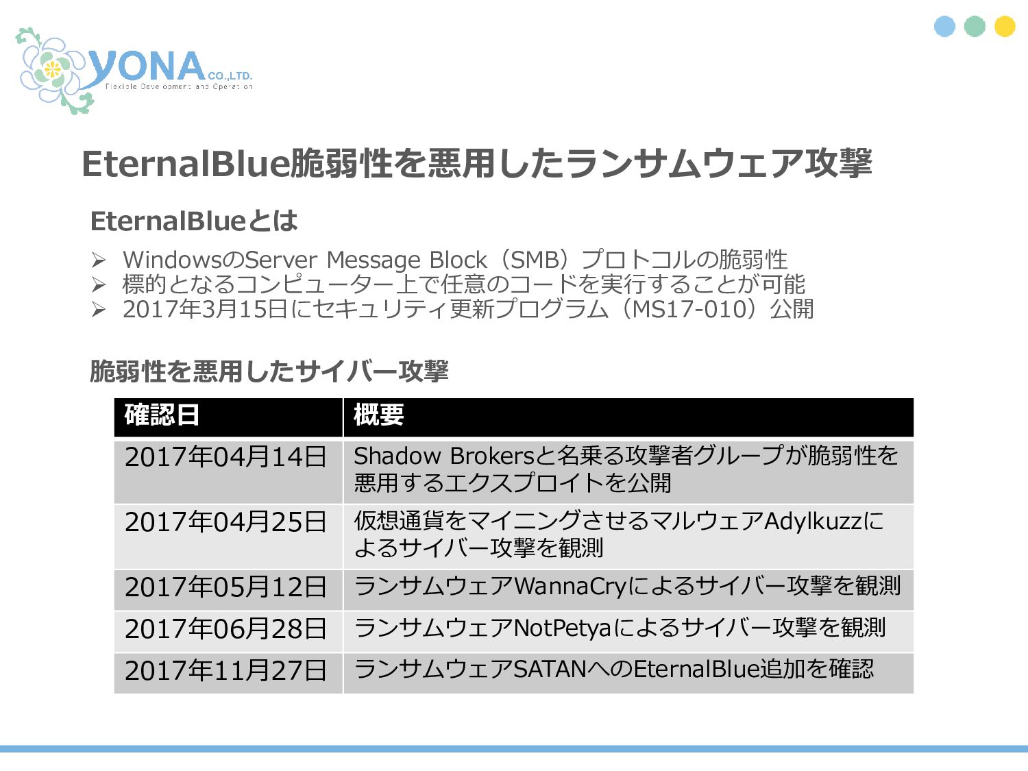 EternalBlue脆弱性を悪用したランサムウェア攻撃 EternalBlueとは ➢ WindowsのServer Message Block(SMB)プロトコルの脆弱性 ➢ 標的となるコンピューター上で任意のコードを実行することが可能 ➢ 2017年3月15日にセキュリティ更新プログラム(MS17-010)公開