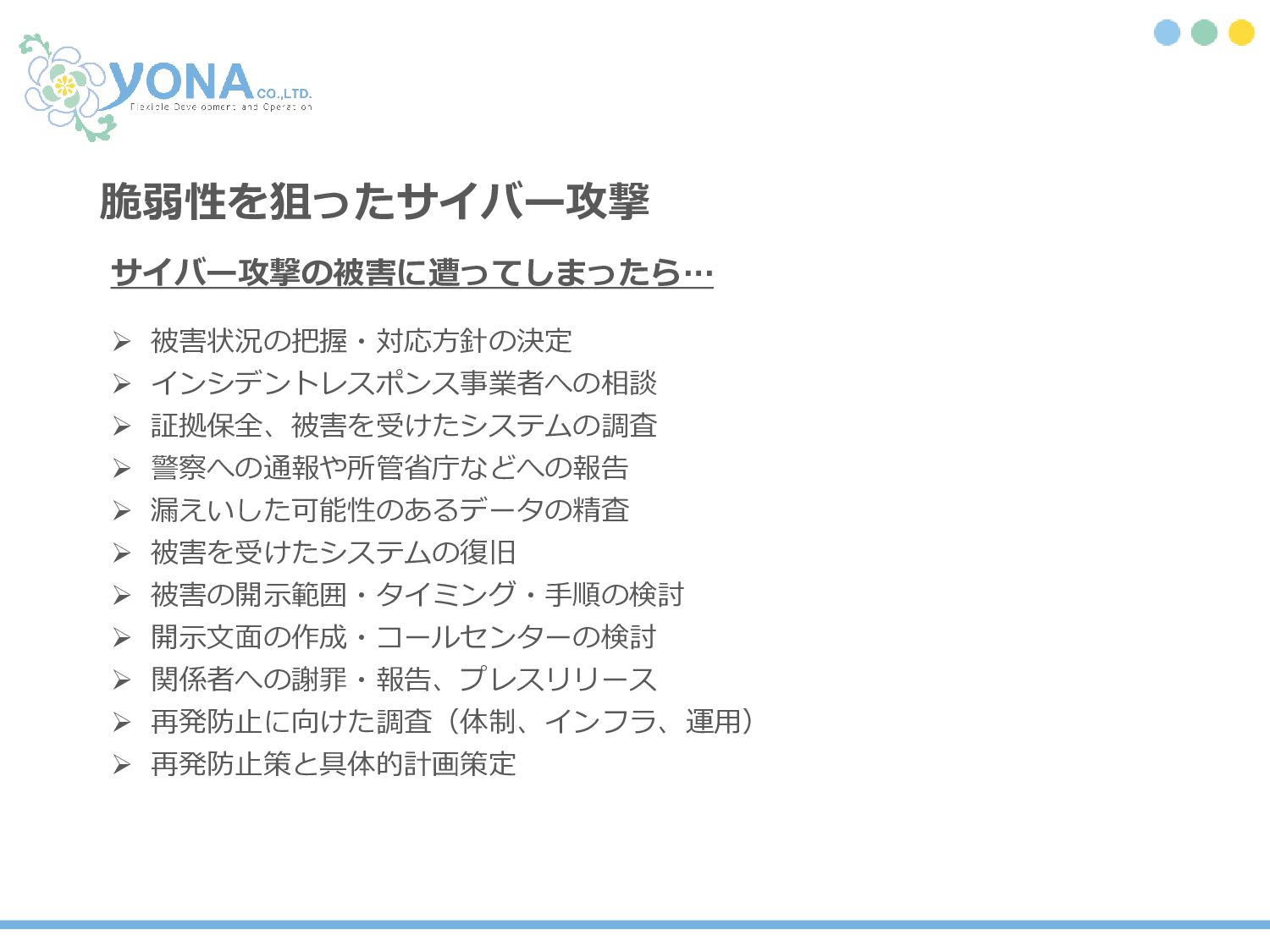 ➢ 漏えいした可能性のあるデータの精査 ➢ 被害を受けたシステムの復旧 ➢ 被害の開示範囲・タイミング・手順の検討 ➢ 開示文面の作成・コールセンターの検討 ➢ 関係者への謝罪・報告、プレスリリース ➢ 再発防止に向けた調査(体制、インフラ、運用) ➢ 再発防止策と具体的計画策定