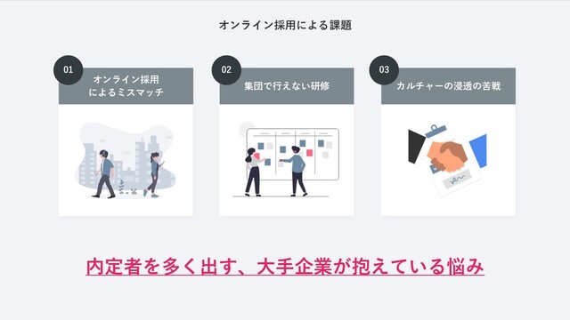 オンライン採⽤による課題 内定者を多く出す、⼤⼿企業が抱えている悩み オンライン採⽤ によるミスマッチ 01 集団で⾏えない研修 カルチャーの浸透の苦戦 02