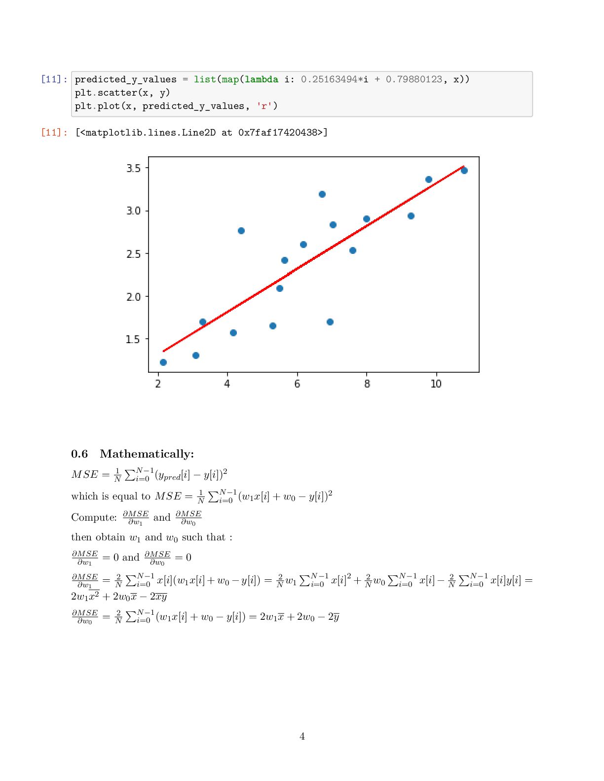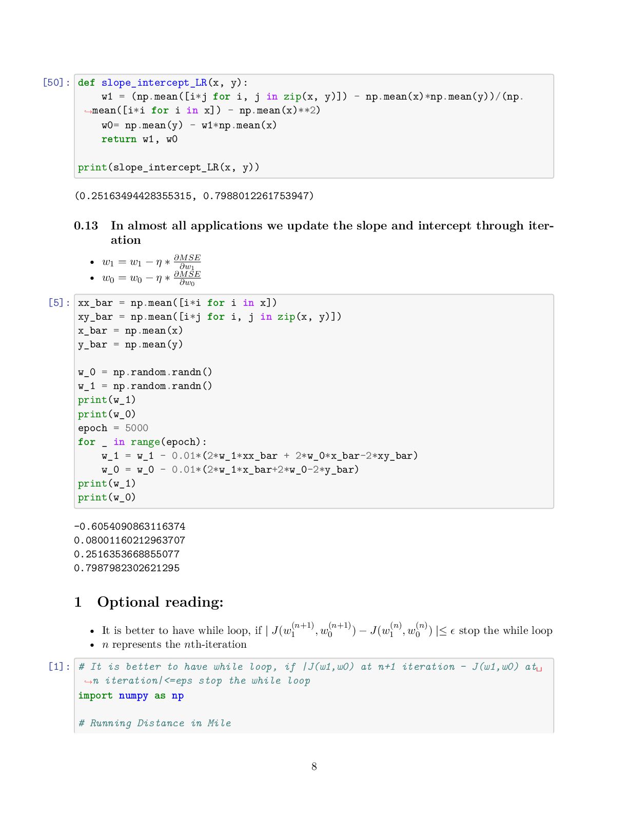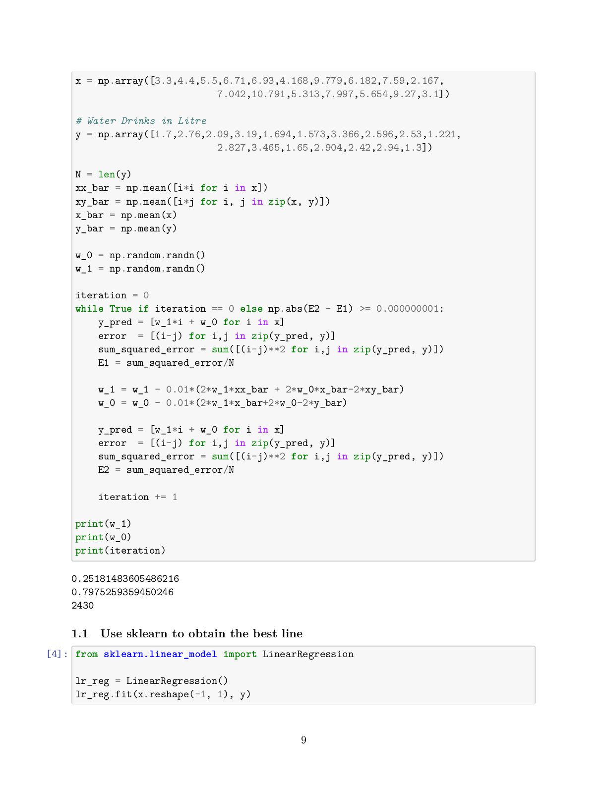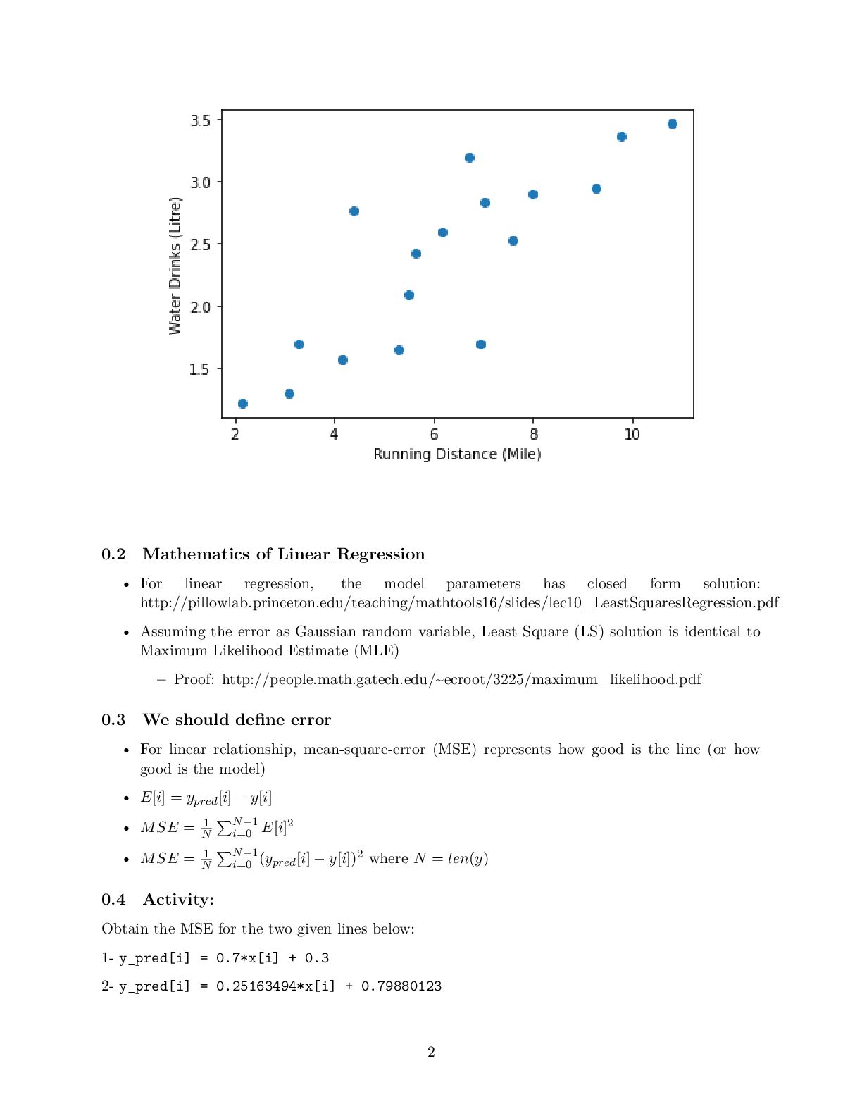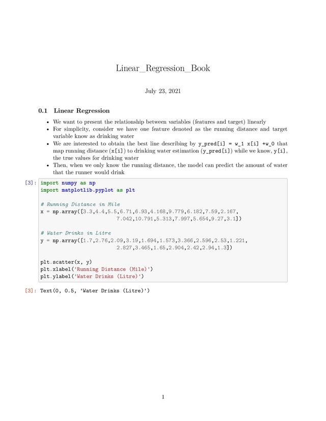 to present the relationship between variables (features and target) linearly • For simplicity, consider we have one feature denoted as the running distance and target variable know as drinking water • We are interested to obtain the best line describing by y_pred[i] = w_1 x[i] +w_0 that map running distance (x[i]) to drinking water estimation (y_pred[i]) while we know, y[i], the true values for drinking water • Then, when we only know the running distance, the model can predict the amount of water that the runner would drink [3]: import numpy as np import matplotlib.pyplot as plt # Running Distance in Mile x = np.array([3.3,4.4,5.5,6.71,6.93,4.168,9.779,6.182,7.59,2.167, 7.042,10.791,5.313,7.997,5.654,9.27,3.1]) # Water Drinks in Litre y = np.array([1.7,2.76,2.09,3.19,1.694,1.573,3.366,2.596,2.53,1.221, 2.827,3.465,1.65,2.904,2.42,2.94,1.3]) plt.scatter(x, y) plt.xlabel('Running Distance (Mile)') plt.ylabel('Water Drinks (Litre)') [3]: Text(0, 0.5, 'Water Drinks (Litre)') 1