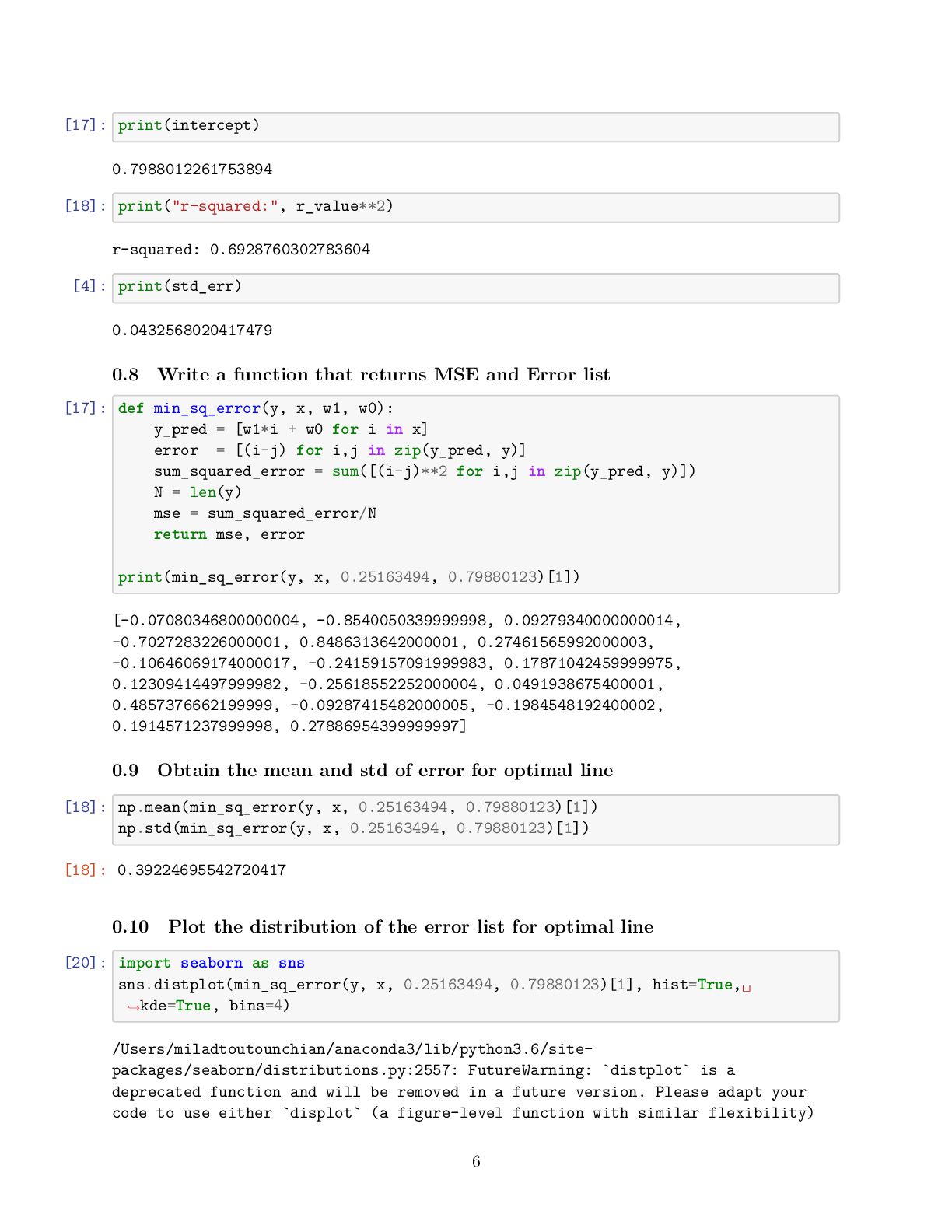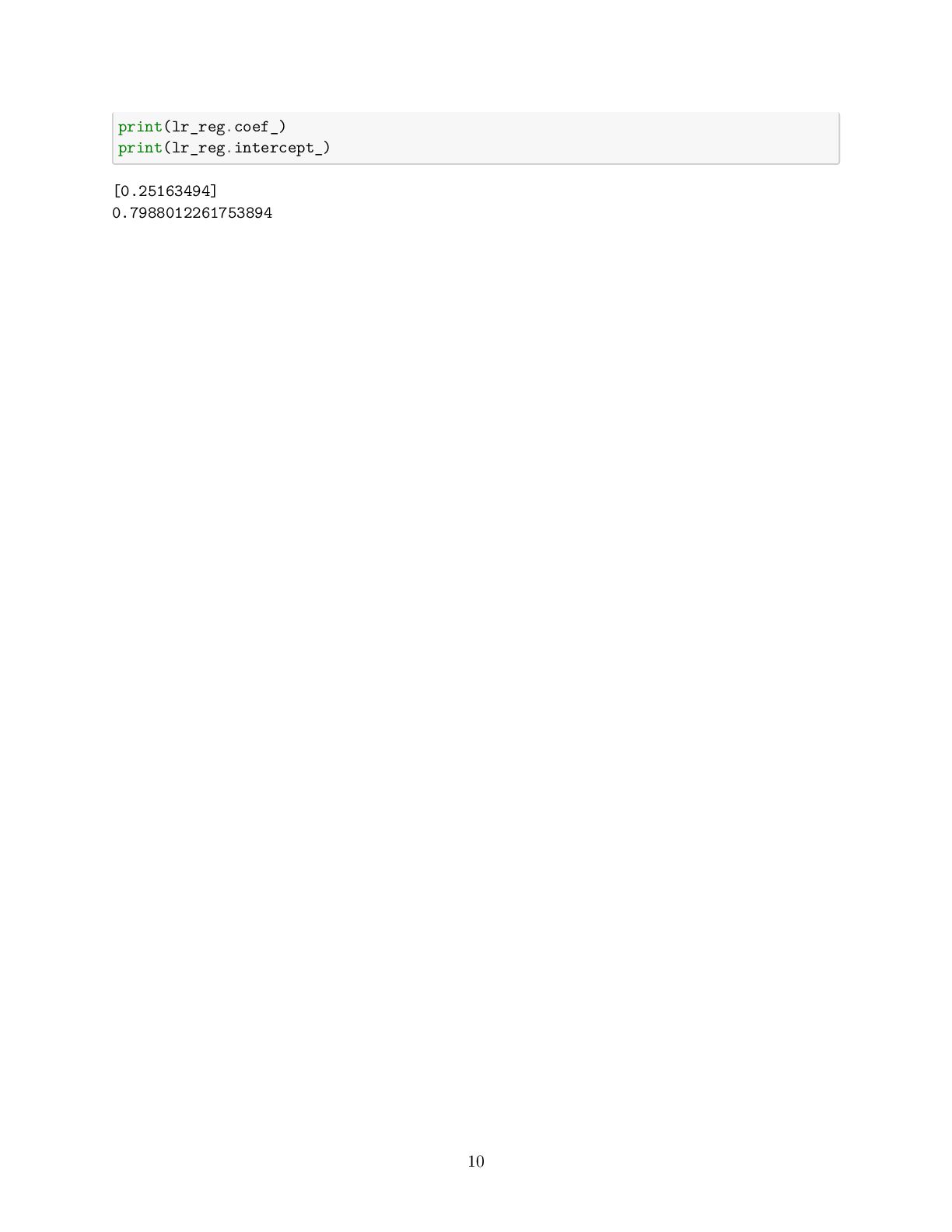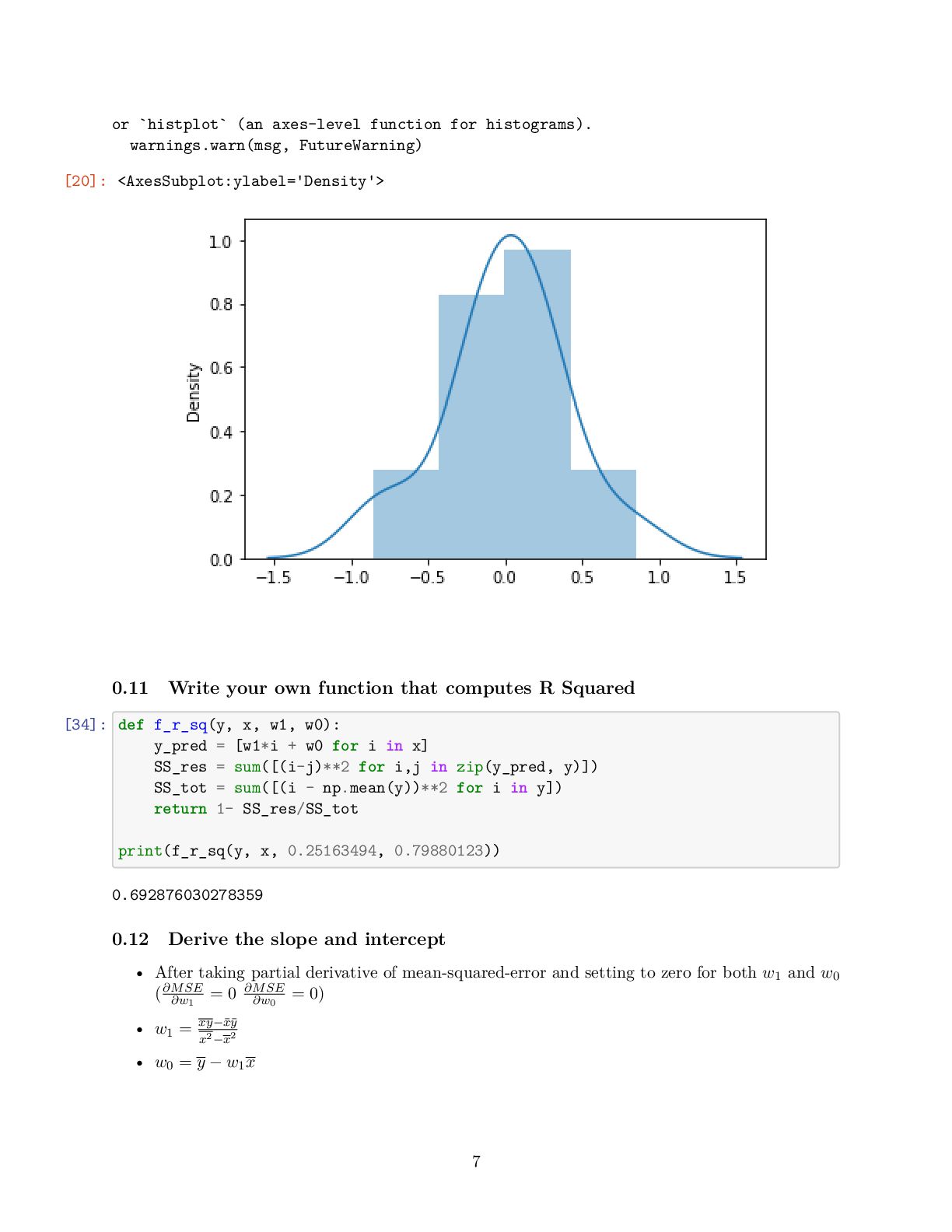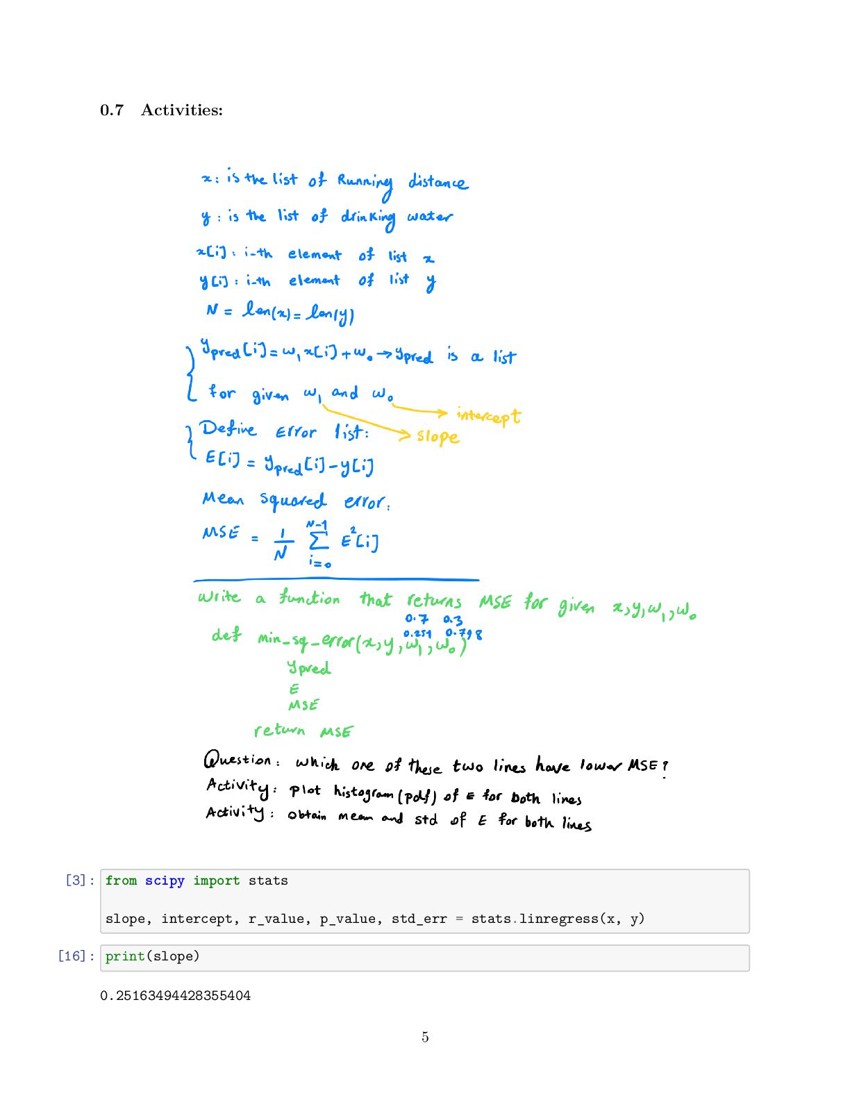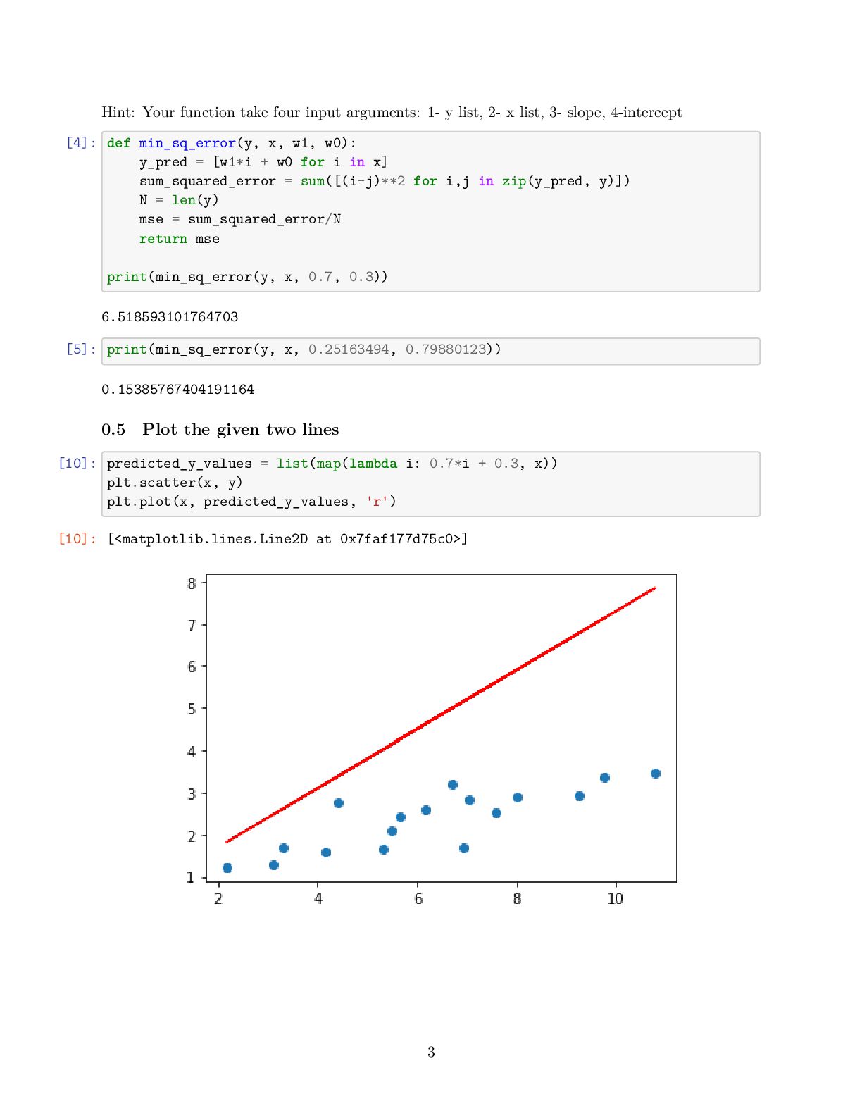 to present the relationship between variables (features and target) linearly • For simplicity, consider we have one feature denoted as the running distance and target variable know as drinking water • We are interested to obtain the best line describing by y_pred[i] = w_1 x[i] +w_0 that map running distance (x[i]) to drinking water estimation (y_pred[i]) while we know, y[i], the true values for drinking water • Then, when we only know the running distance, the model can predict the amount of water that the runner would drink [3]: import numpy as np import matplotlib.pyplot as plt # Running Distance in Mile x = np.array([3.3,4.4,5.5,6.71,6.93,4.168,9.779,6.182,7.59,2.167, 7.042,10.791,5.313,7.997,5.654,9.27,3.1]) # Water Drinks in Litre y = np.array([1.7,2.76,2.09,3.19,1.694,1.573,3.366,2.596,2.53,1.221, 2.827,3.465,1.65,2.904,2.42,2.94,1.3]) plt.scatter(x, y) plt.xlabel('Running Distance (Mile)') plt.ylabel('Water Drinks (Litre)') [3]: Text(0, 0.5, 'Water Drinks (Litre)') 1