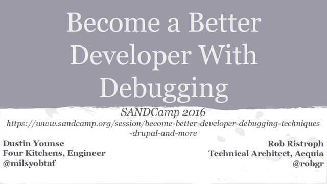 In this session we will give you a tour of useful debugging tools and techniques that can help you start to see into the inner workings of any version of Drupal, and give you a look behind the curtain at just what the browser is doing while the spinner spins.