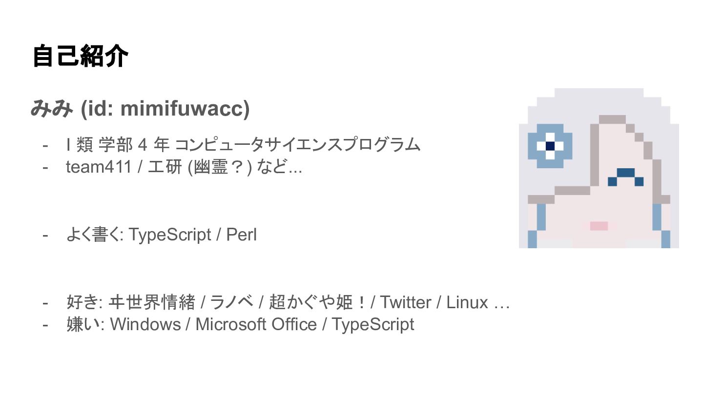 コンピュータサイエンスプログラム - team411 / 工研 (幽霊?) など... - よく書く: TypeScript / Perl - 好き: ヰ世界情緒 / ラノベ / 超かぐや姫!/ Twitter / Linux … - 嫌い: Windows / Microsoft Office / TypeScript
