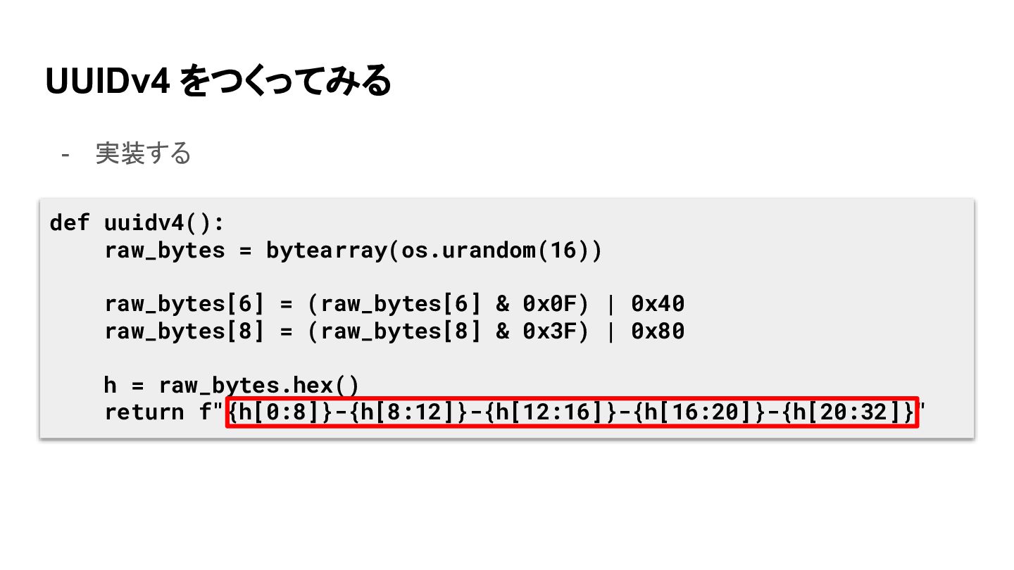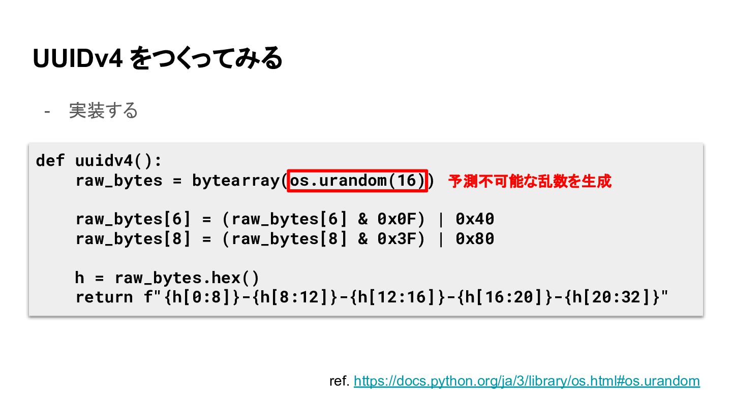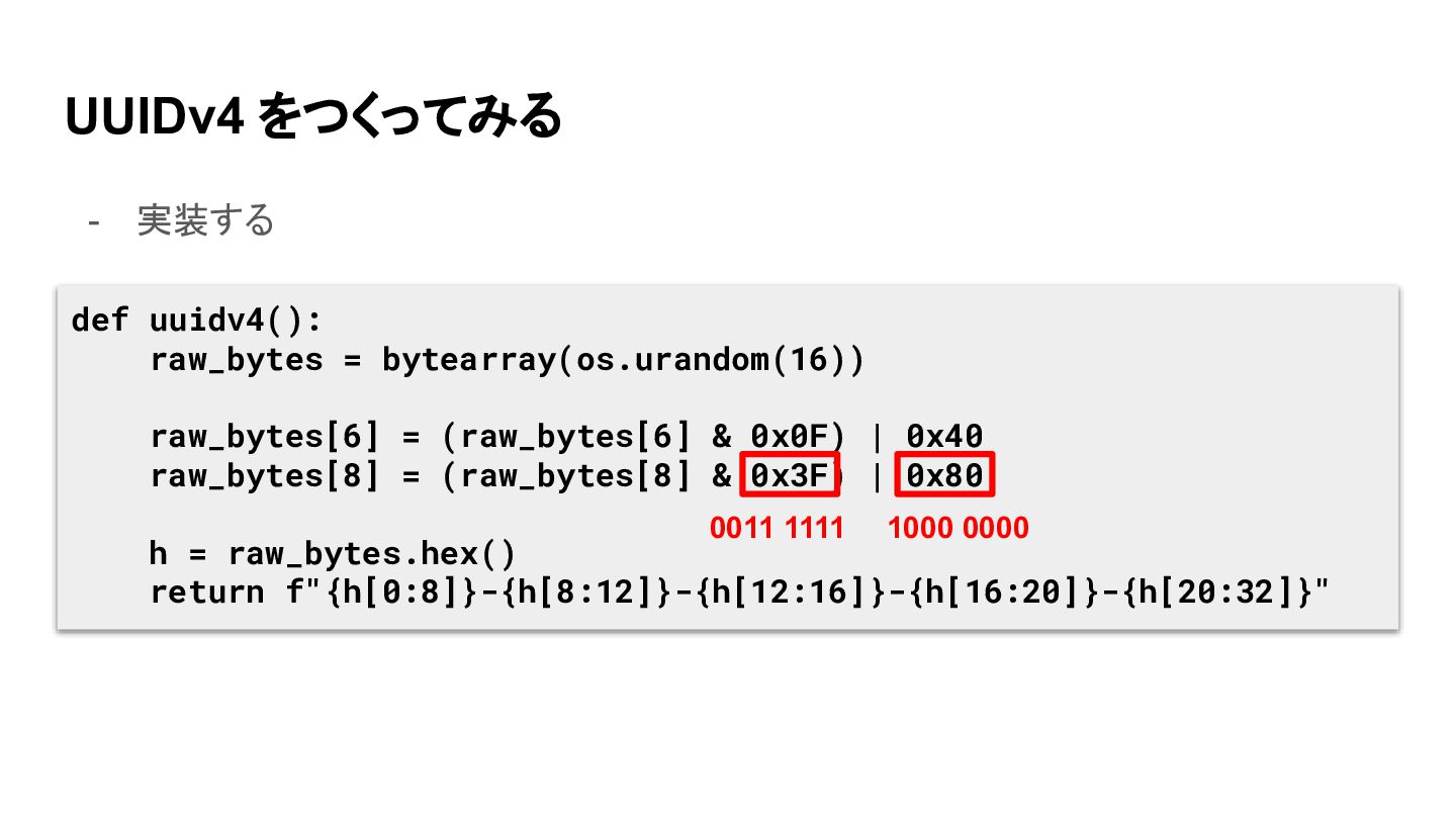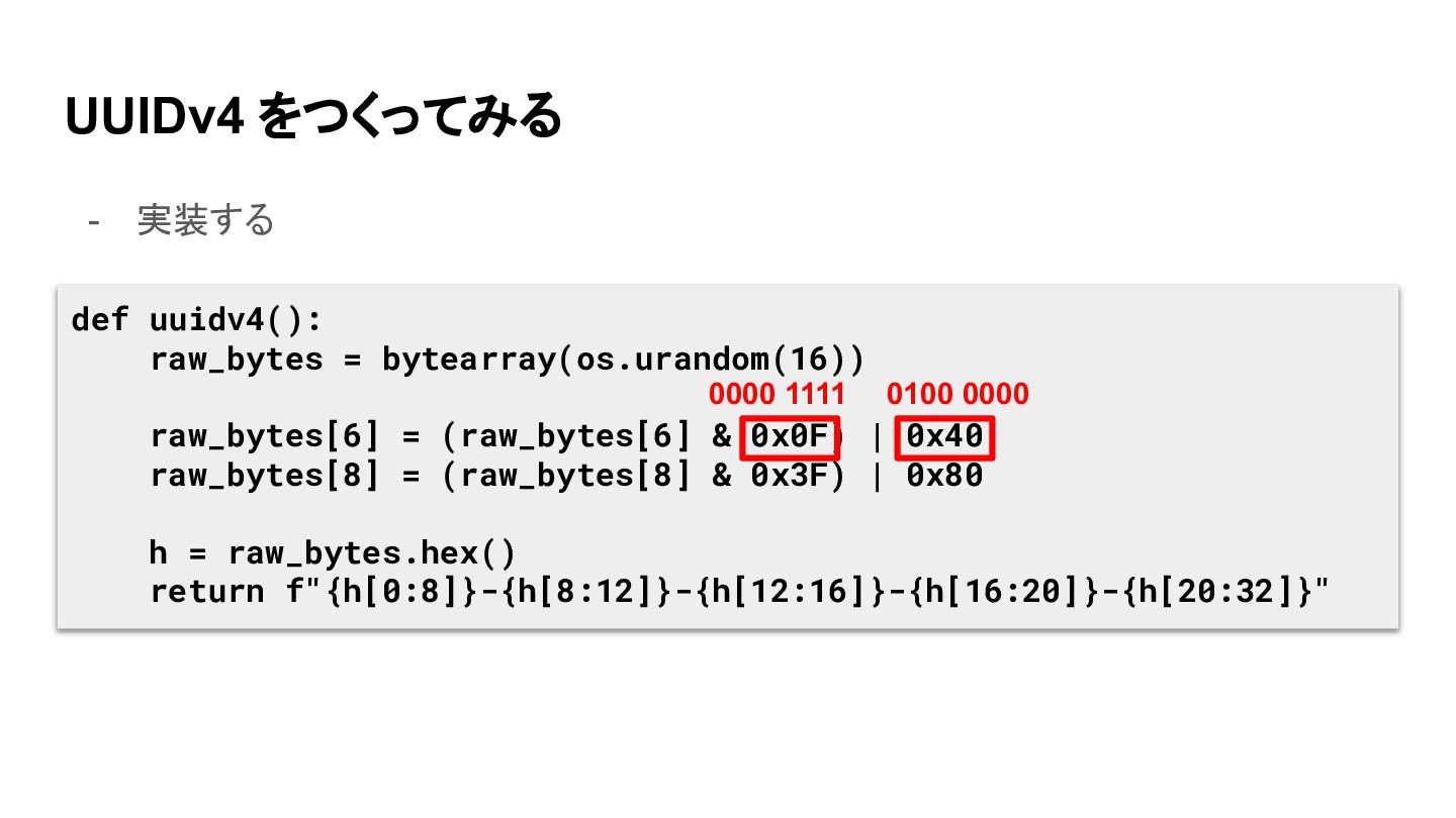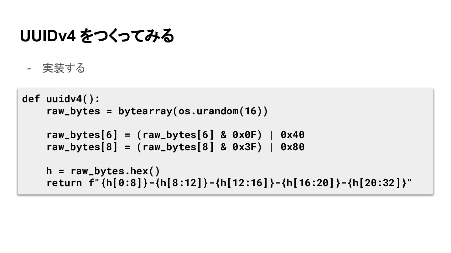 UUIDv4 をつくってみる - 実装する def uuidv4(): raw_bytes = bytearray(os.urandom(16)) raw_bytes[6]
