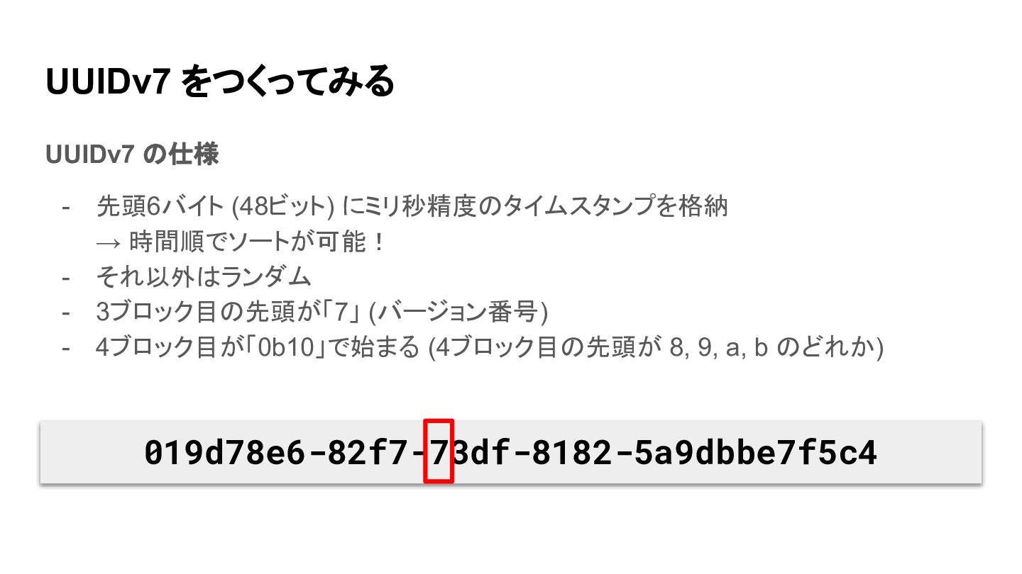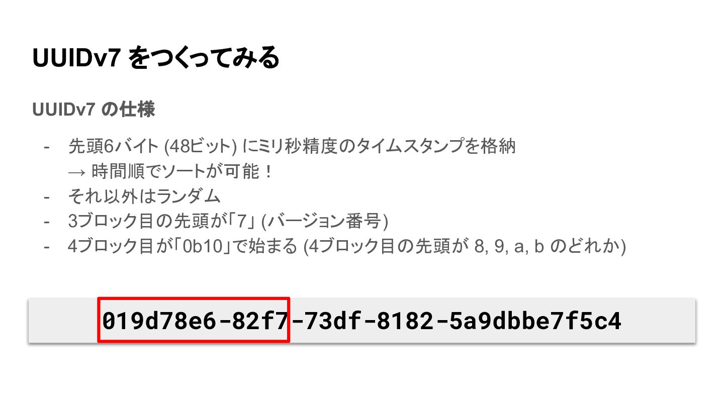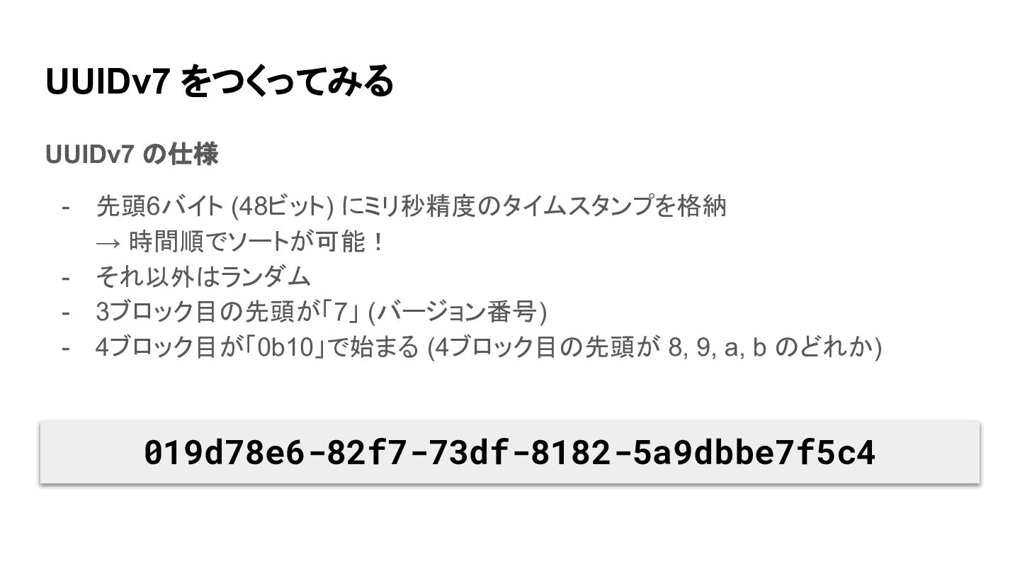 UUIDv7 をつくってみる UUIDv7 の仕様 - 先頭6バイト (48ビット) にミリ秒精度のタイムスタンプを格納 → 時間順でソートが可能!